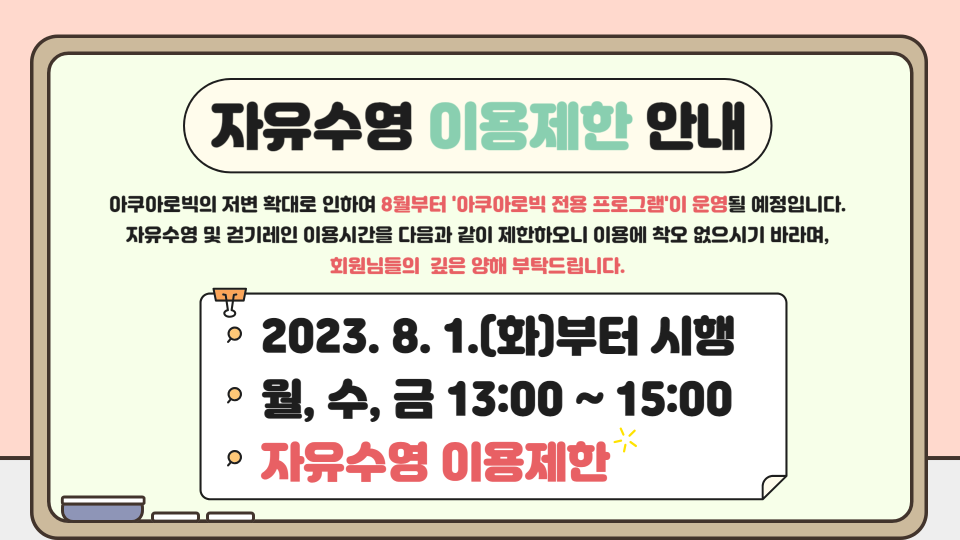 공지 아쿠아로빅 강습 확대 및 자유수영 이용시간 변경 안내 작성자 : 관리자 조회 : 1,225 등록일시 : 2023년 7월 6일 13시 11분 50초 이용시간변경안내-006 (2).png [ Size : 284.07KB, Down : 1,580 ] 미리보기 다운로드 목록보기