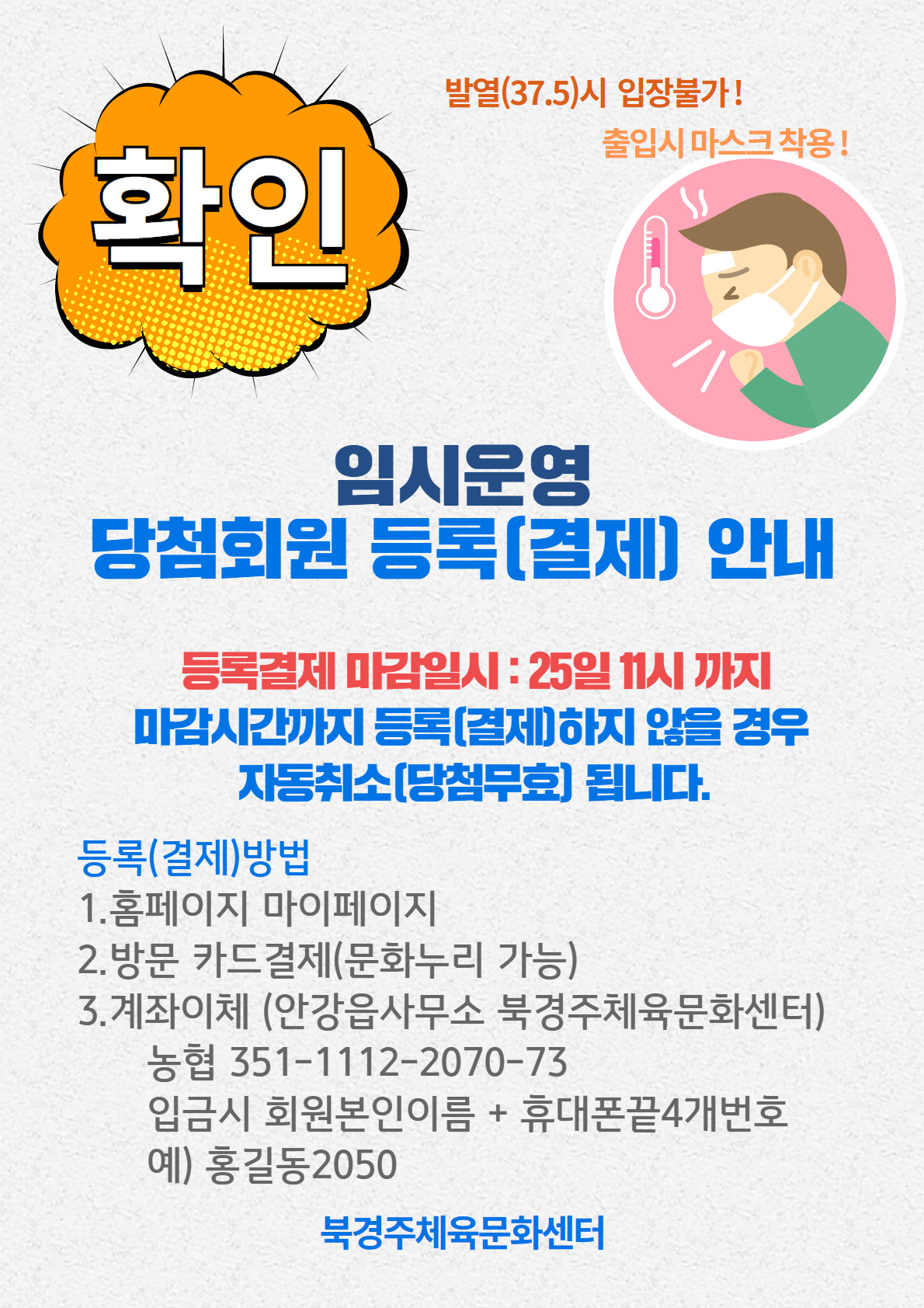 7월 임시운영 당첨 등록(결제) 안내 작성자 : 관리자 조회 : 775 등록일시 : 2020년 6월 22일 11시 2분 17초 당첨회원 등록 안내.jpg [ Size : 704.26KB, Down : 1,203 ] 미리보기 다운로드 목록보기