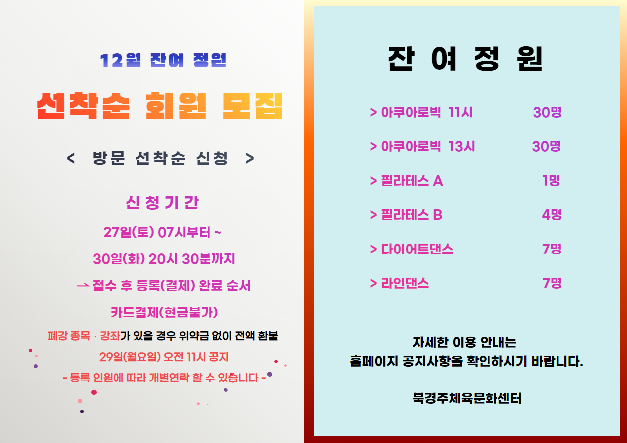 12월 잔여정원 선착순 회원모집 안내 작성자 : 관리자 조회 : 606 등록일시 : 2021년 11월 26일 8시 23분 14초 12월 잔여정원 선착순.png [ Size : 215.13KB, Down : 615 ] 미리보기 다운로드 잔여정원은 공지시각 기준입니다. 선착순 모집 시간부터 잔여정원은 조기 마감될 수 있습니다. 목록보기