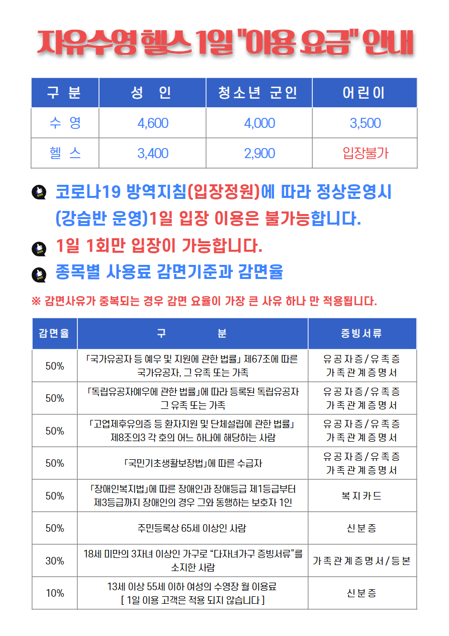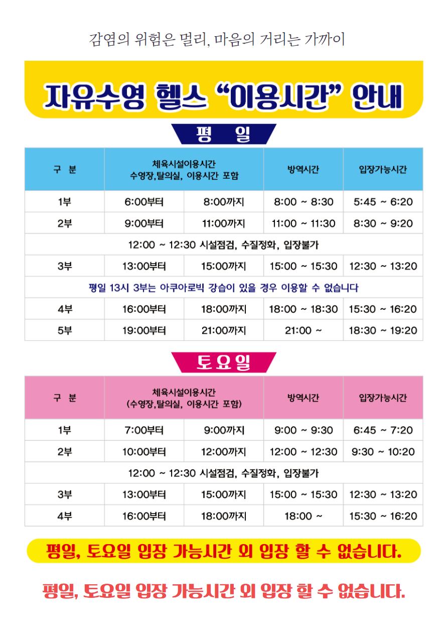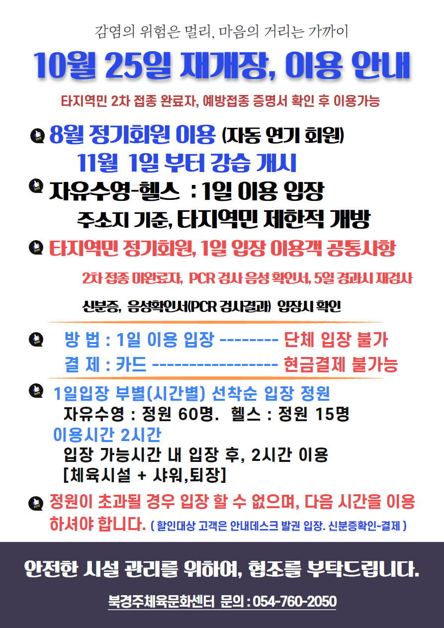 10월 25일 재개장, 이용안내 (8월 정기회원 강습, 11월 1일 개강) 작성자 : 관리자 조회 : 1,249 등록일시 : 2021년 10월 20일 10시 17분 33초 1.png [ Size : 154.48KB, Down : 1,660 ] 미리보기 다운로드 2.png [ Size : 438.14KB, Down : 1,663 ] 미리보기 다운로드 3.png [ Size : 145.19KB, Down : 1,559 ] 미리보기 다운로드 목록보기