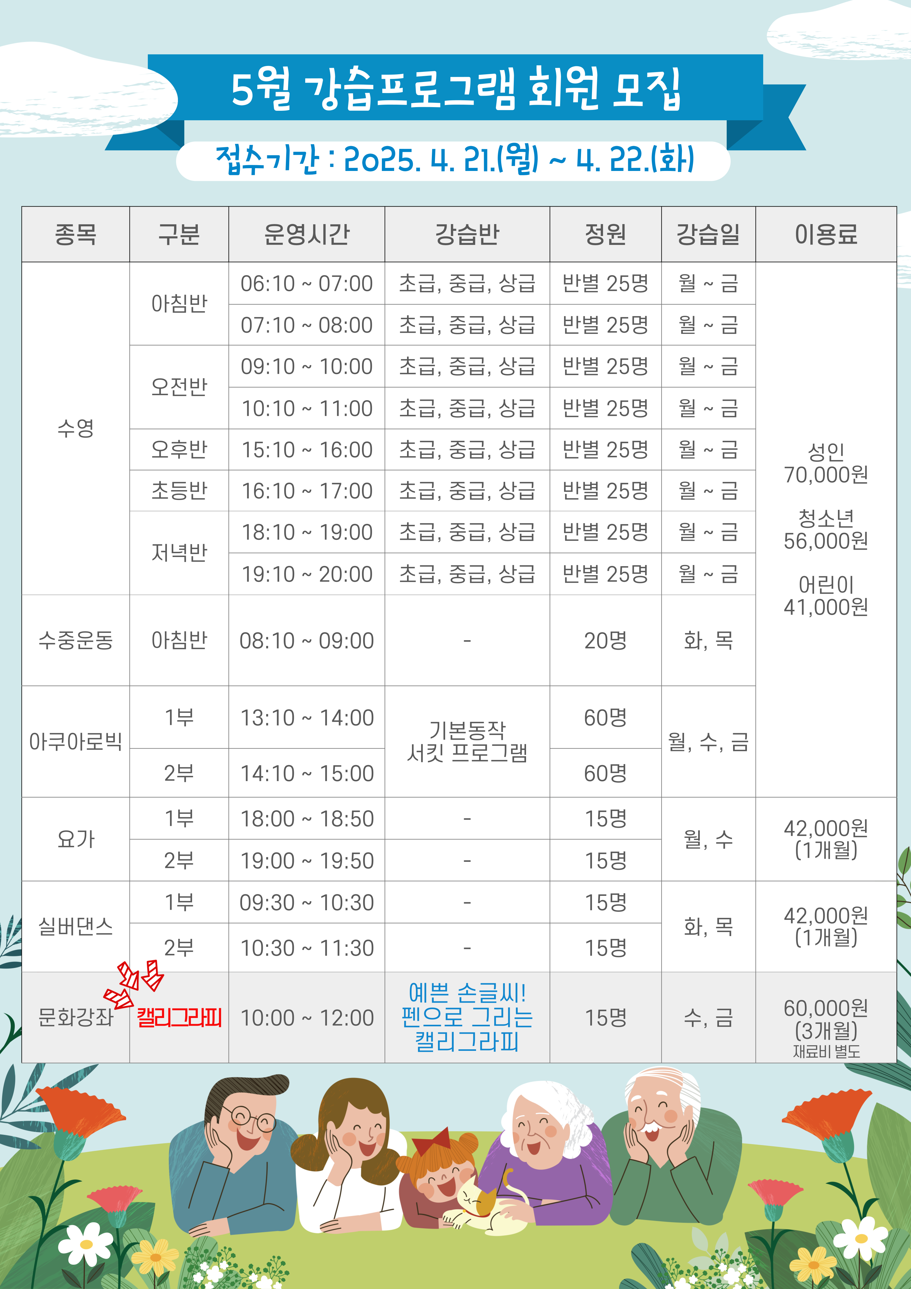 2025년 5월 강습 모집 & 접수 및 등록 안내 작성자 : 관리자 조회 : 591 등록일시 : 2025년 4월 18일 9시 55분 47초 001.png [ Size : 1.67MB, Down : 833 ] 미리보기 다운로드 002.png [ Size : 1.66MB, Down : 799 ] 미리보기 다운로드 목록보기