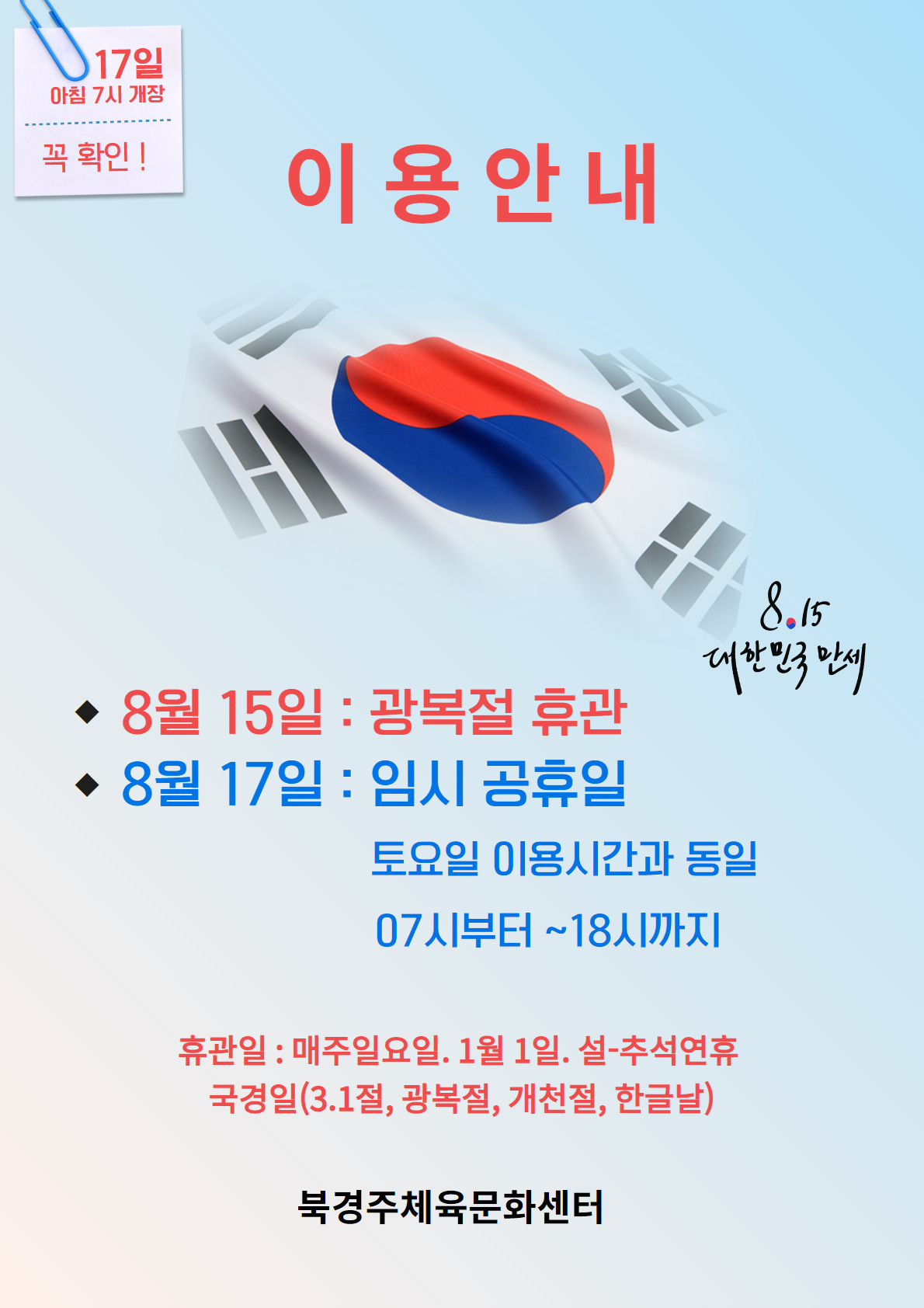 광복절(휴관), 임시 공휴일 이용안내 작성자 : 관리자 조회 : 448 등록일시 : 2020년 8월 5일 6시 22분 8초 광복절 임시공휴일 안내.jpg [ Size : 370.69KB, Down : 450 ] 미리보기 다운로드 목록보기