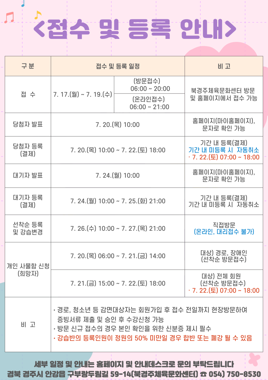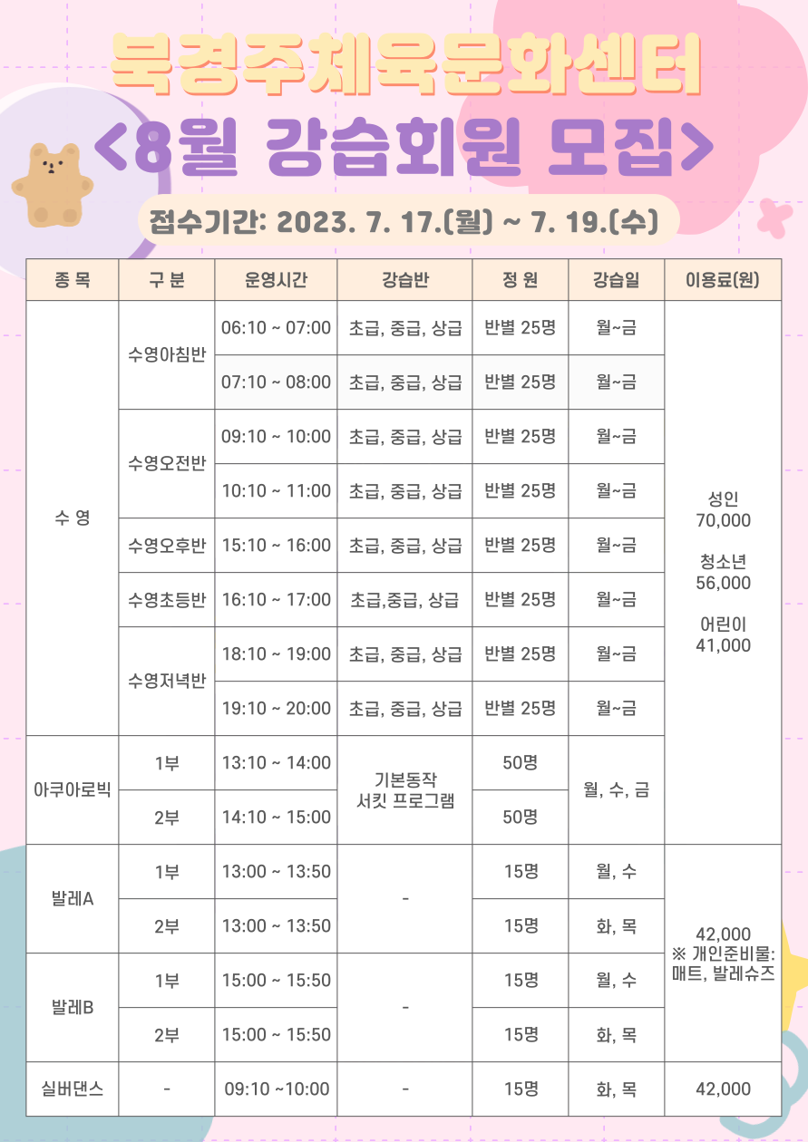 8월 정기회원 모집, 이용 안내 작성자 : 관리자 조회 : 836 등록일시 : 2023년 7월 10일 10시 13분 12초 강습회원모집(8월).png [ Size : 213.05KB, Down : 1,215 ] 미리보기 다운로드 접수및등록안내(8월).png [ Size : 248.41KB, Down : 1,202 ] 미리보기 다운로드 목록보기