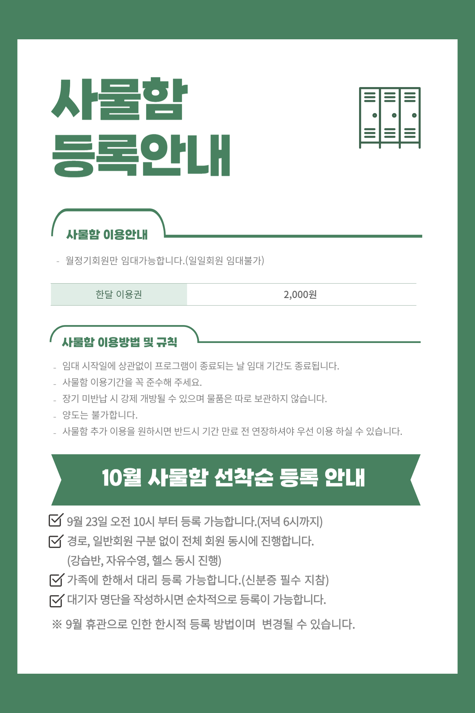 10월 사물함 등록 안내 작성자 : 관리자 조회 : 507 등록일시 : 2024년 9월 9일 13시 54분 38초 사물함임대.png [ Size : 337.75KB, Down : 664 ] 미리보기 다운로드 목록보기