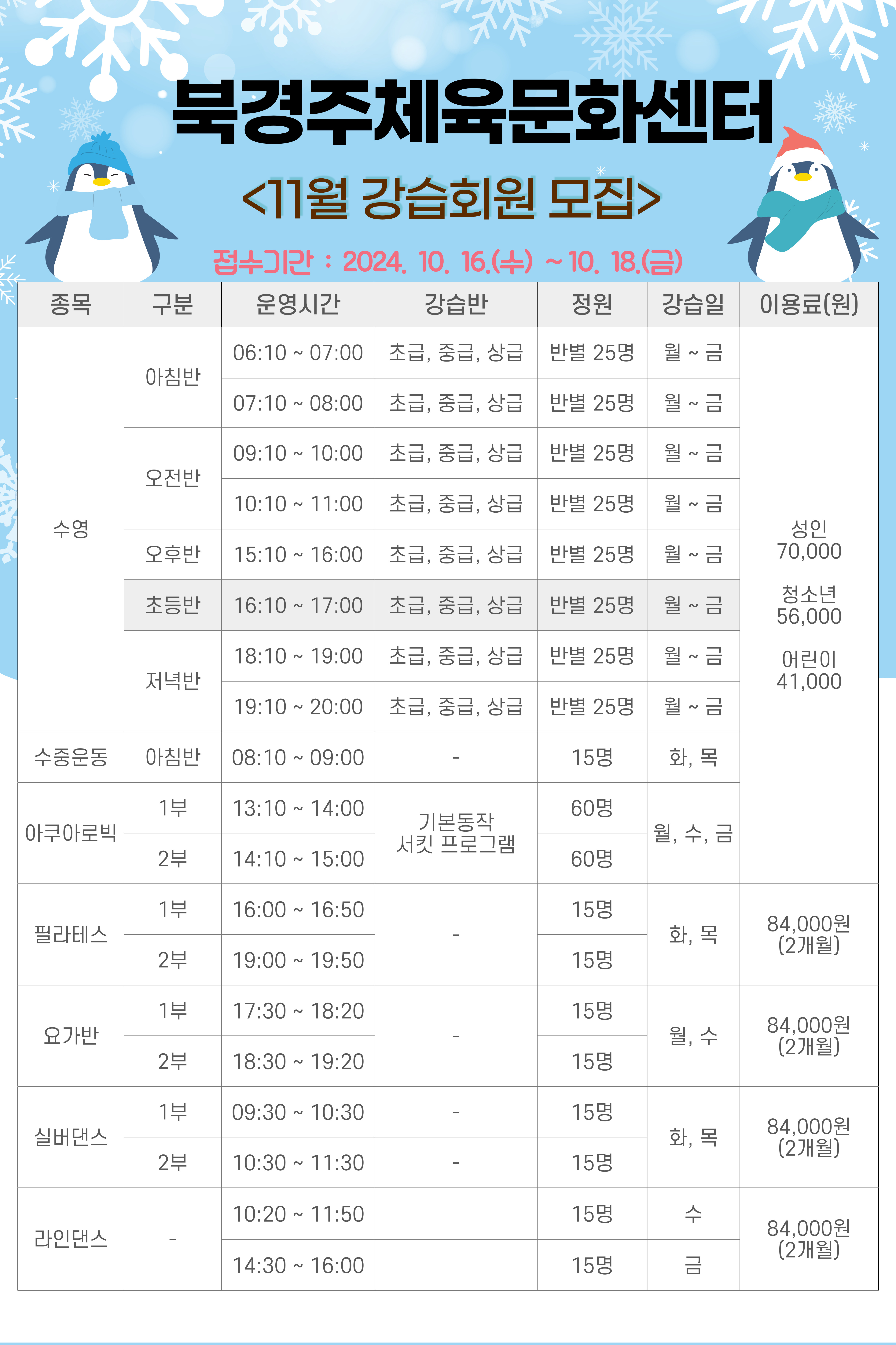 11월 강습 모집 & 접수 및 등록 안내 작성자 : 관리자 조회 : 464 등록일시 : 2024년 10월 15일 11시 50분 51초 11월-강습모집-001.jpg [ Size : 2.02MB, Down : 702 ] 미리보기 다운로드 접수 및 등록 안내.png [ Size : 494.06KB, Down : 715 ] 미리보기 다운로드 목록보기