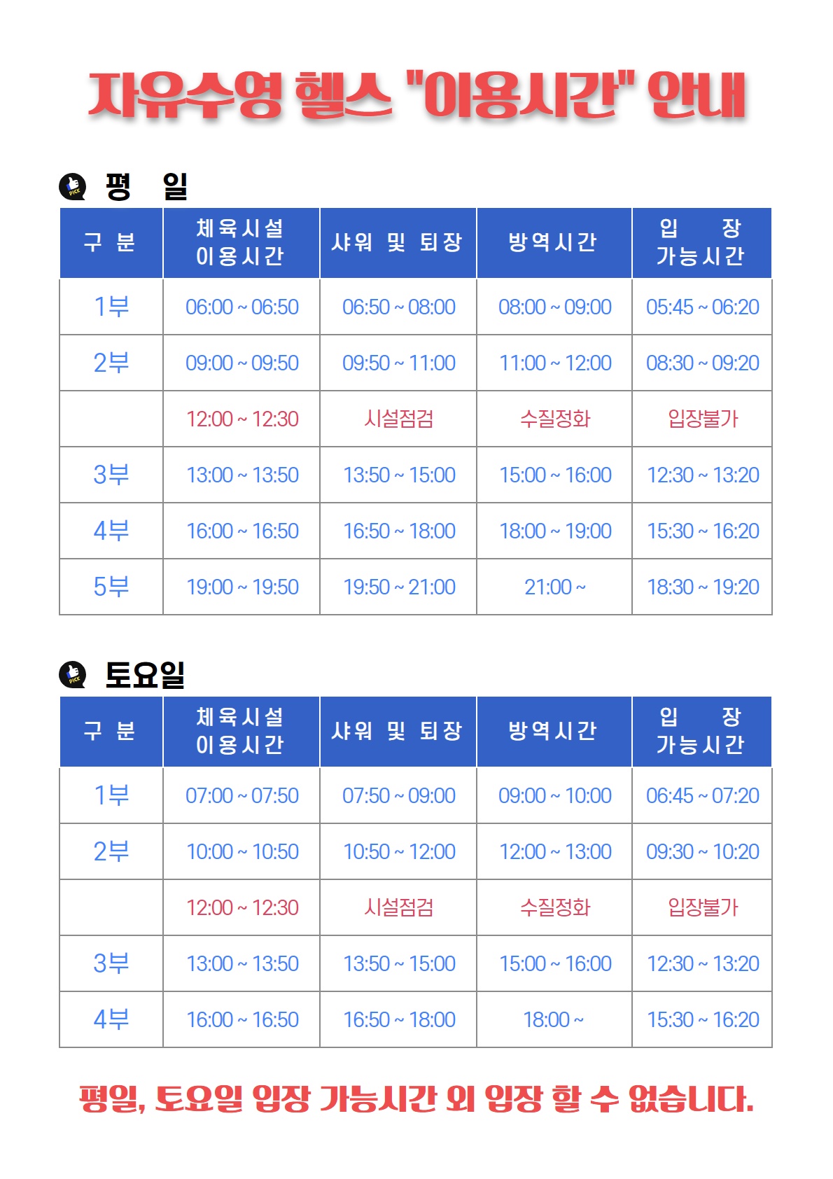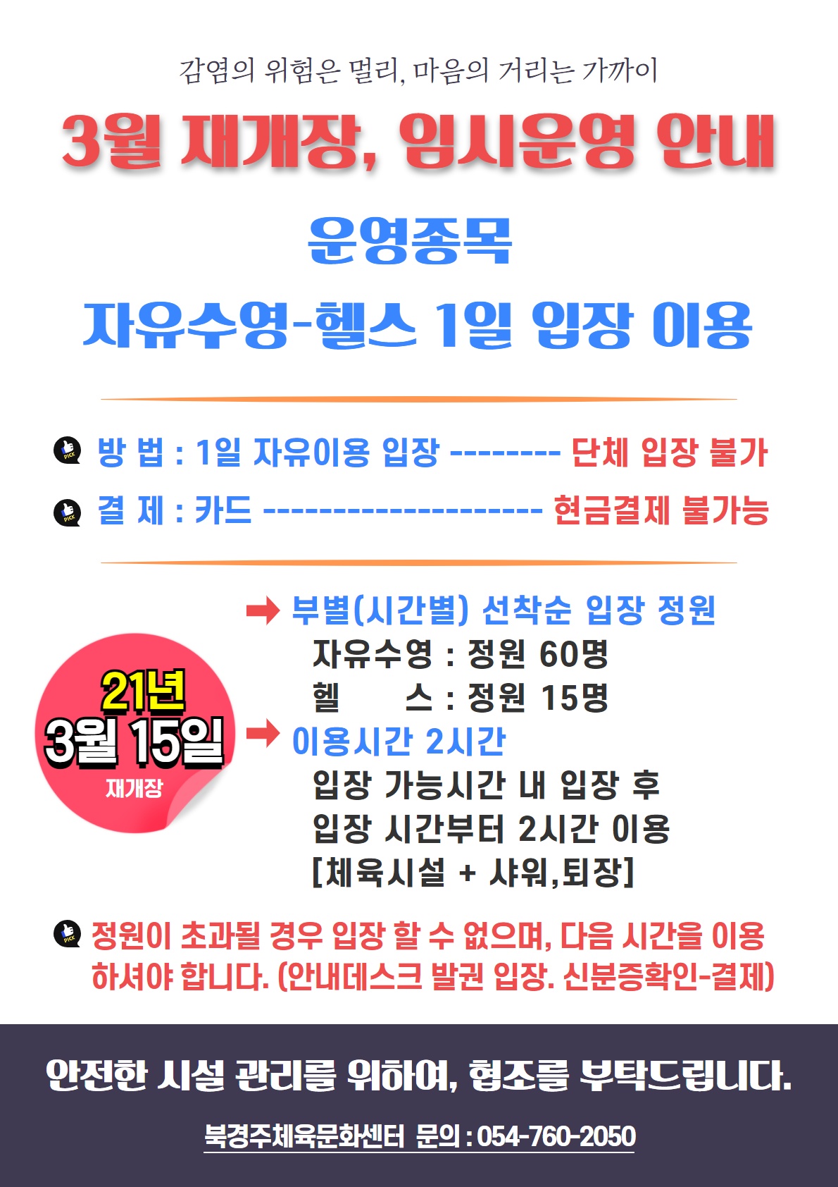 3월 재개장, 임시운영 안내 (자유수영. 헬스 : 1일 입장 이용) 작성자 : 관리자 조회 : 1,309 등록일시 : 2021년 3월 9일 17시 34분 0초 3-1.jpg [ Size : 381.75KB, Down : 1,898 ] 미리보기 다운로드 3-2.jpg [ Size : 354.03KB, Down : 1,854 ] 미리보기 다운로드 3-3.jpg [ Size : 421.45KB, Down : 1,026 ] 미리보기 다운로드 목록보기