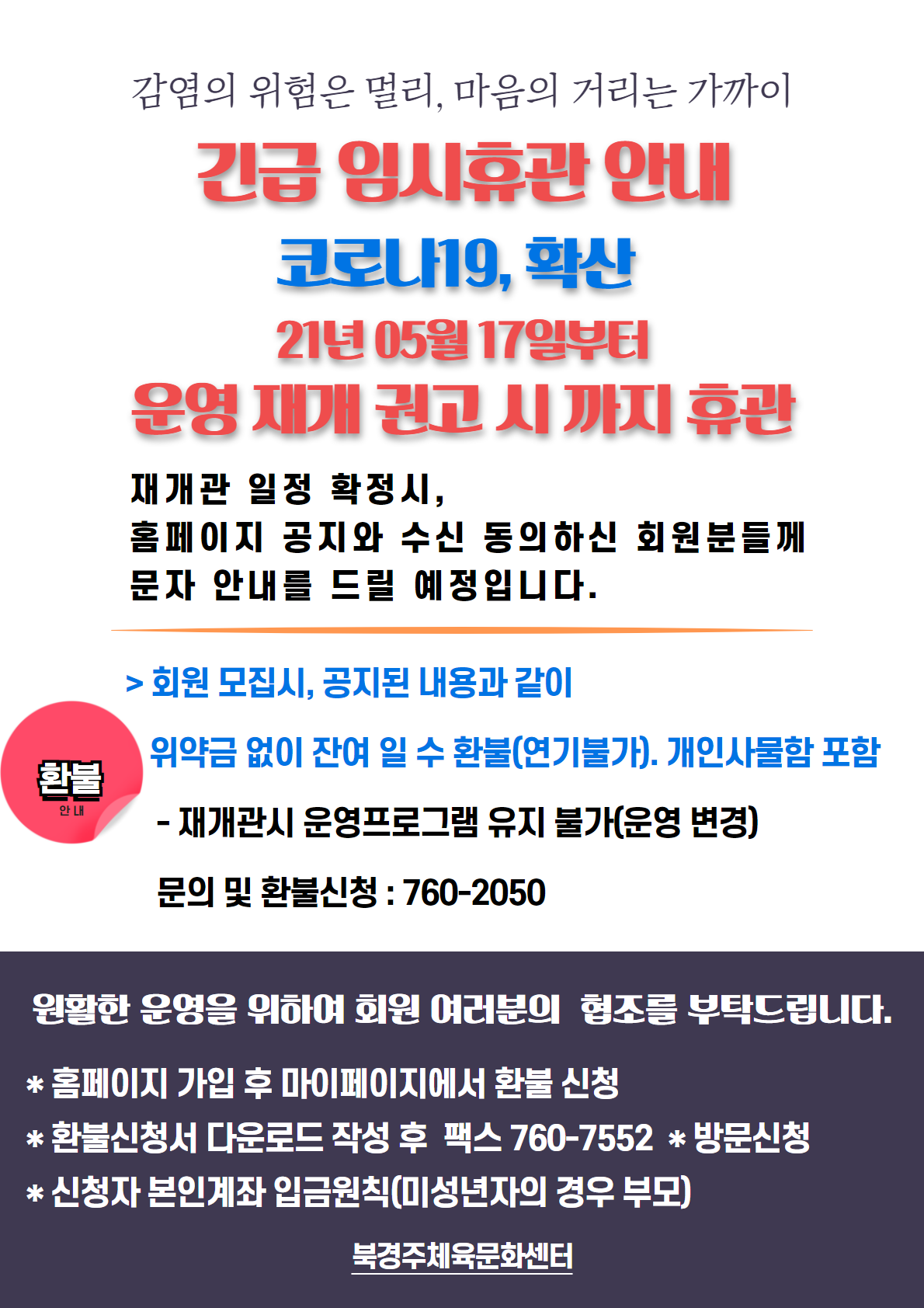 5월 긴급임시휴관 안내 작성자 : 관리자 조회 : 705 등록일시 : 2021년 5월 17일 10시 29분 30초 환불신청서.hwp [ Size : 13.5KB, Down : 196 ] 다운로드 05월 긴급임시휴관.png [ Size : 242.46KB, Down : 505 ] 미리보기 다운로드 환불 규정.JPG [ Size : 69.38KB, Down : 570 ] 미리보기 다운로드 목록보기