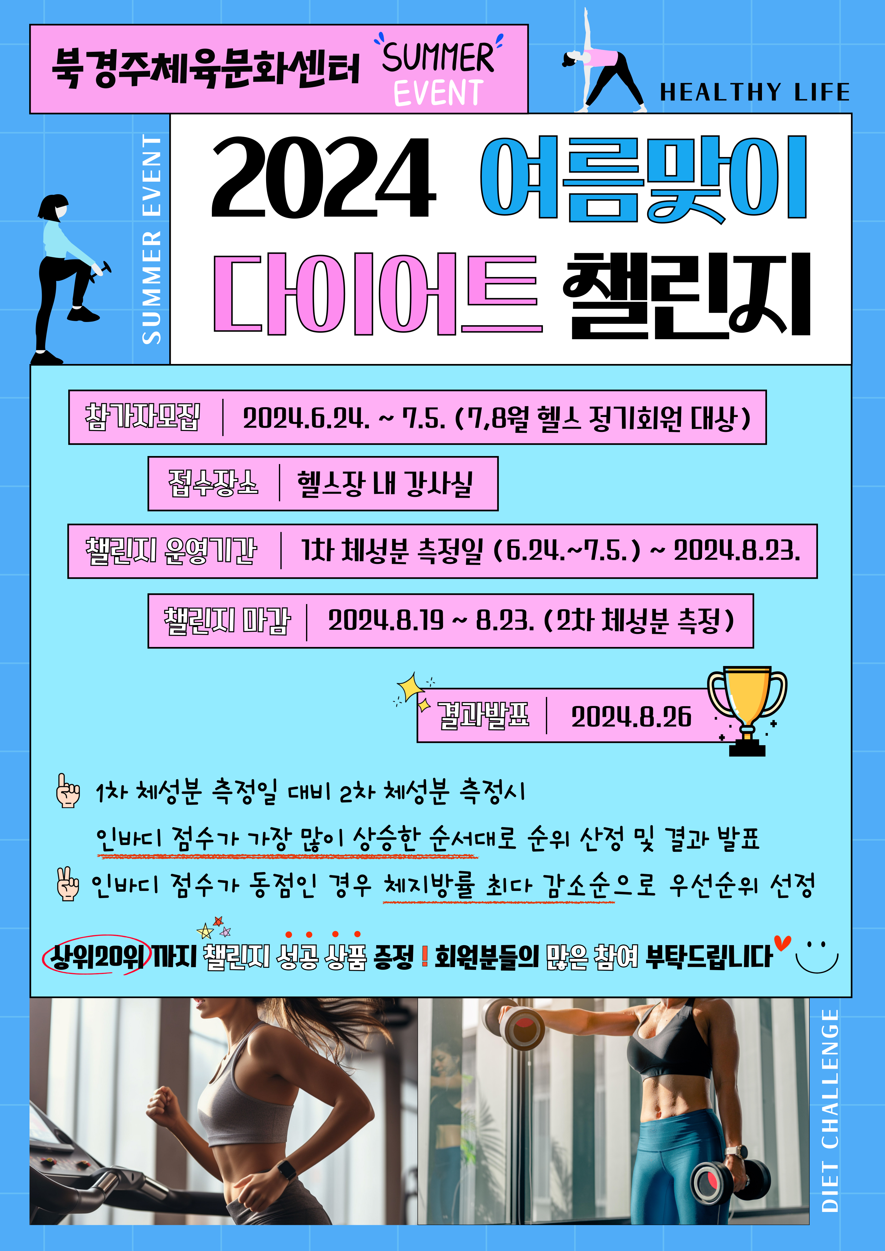 북경주체육문화센터 2024년 여름맞이 다이어트 챌린지 작성자 : 관리자 조회 : 604 등록일시 : 2024년 6월 21일 10시 17분 25초 2024 다이어트 챌린지.png [ Size : 2.62MB, Down : 774 ] 미리보기 다운로드 목록보기