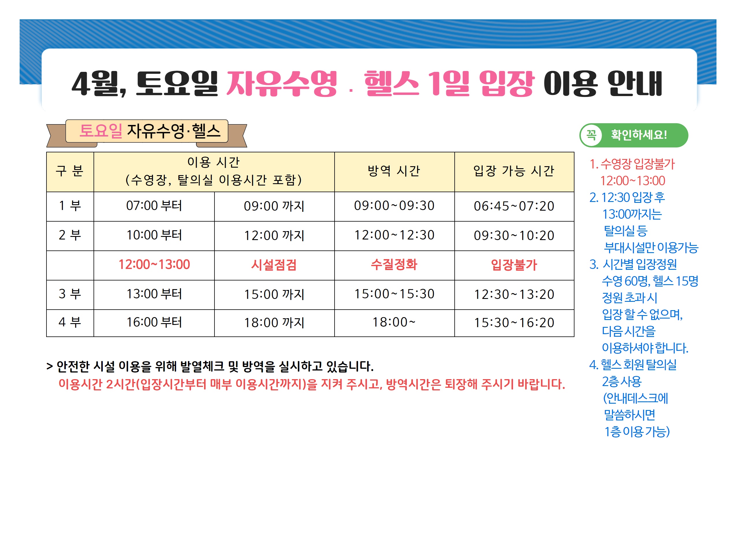 4월 자유수영 헬스 1일입장 이용 안내 작성자 : 관리자 조회 : 758 등록일시 : 2021년 3월 25일 9시 45분 5초 21년 4월 평일 자유수영 헬스 이용공지-수정본.jpg [ Size : 844.86KB, Down : 1,026 ] 미리보기 다운로드 21년 4월 토요일 자유수영 헬스 이용공지-수정본.jpg [ Size : 607.67KB, Down : 1,015 ] 미리보기 다운로드 목록보기