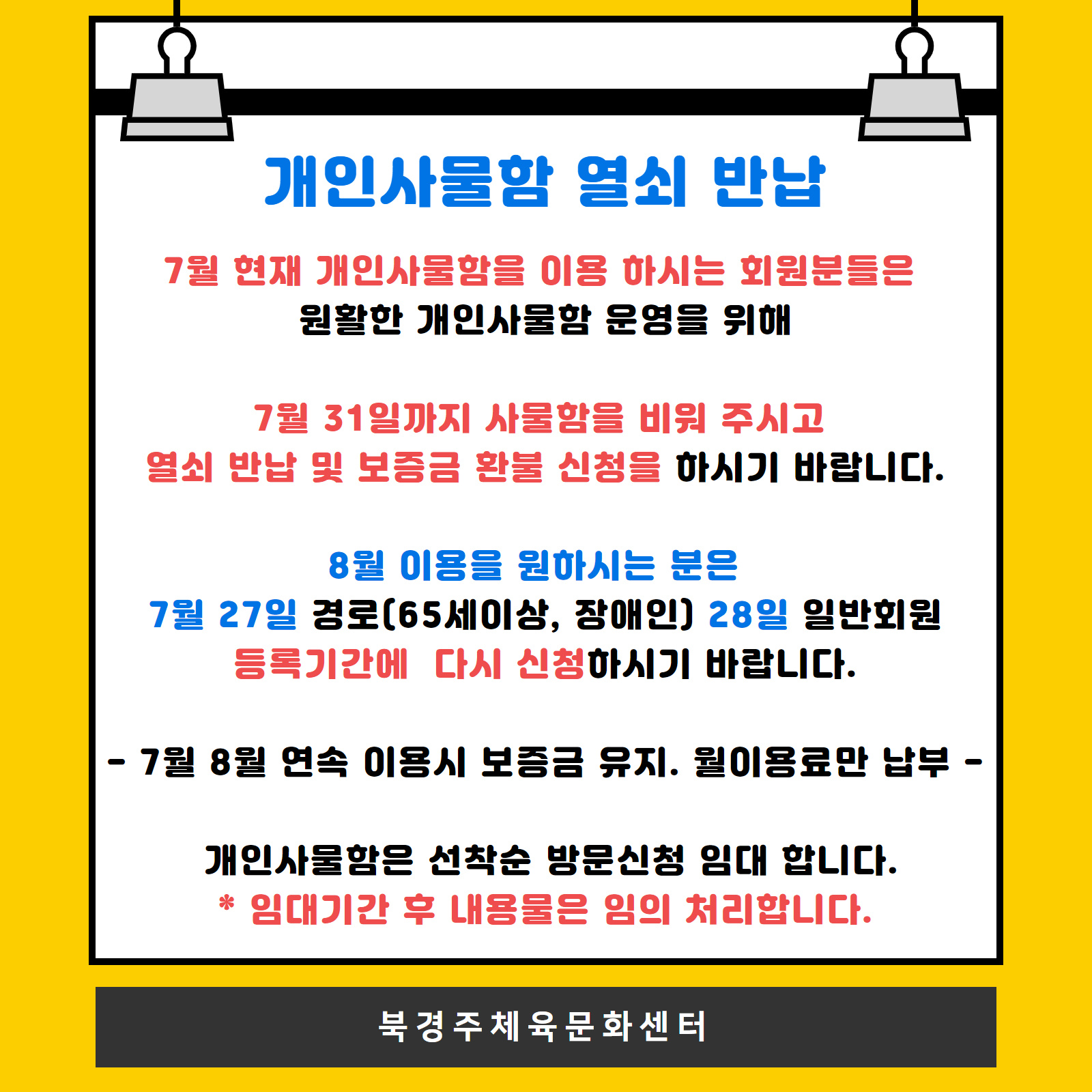 개인사물함 7월 이용회원, 키반납 - 보증금 환불신청, 8월 신청 작성자 : 관리자 조회 : 498 등록일시 : 2020년 7월 25일 10시 13분 13초 개인사물함 키 반납.jpg [ Size : 588.24KB, Down : 546 ] 미리보기 다운로드 목록보기