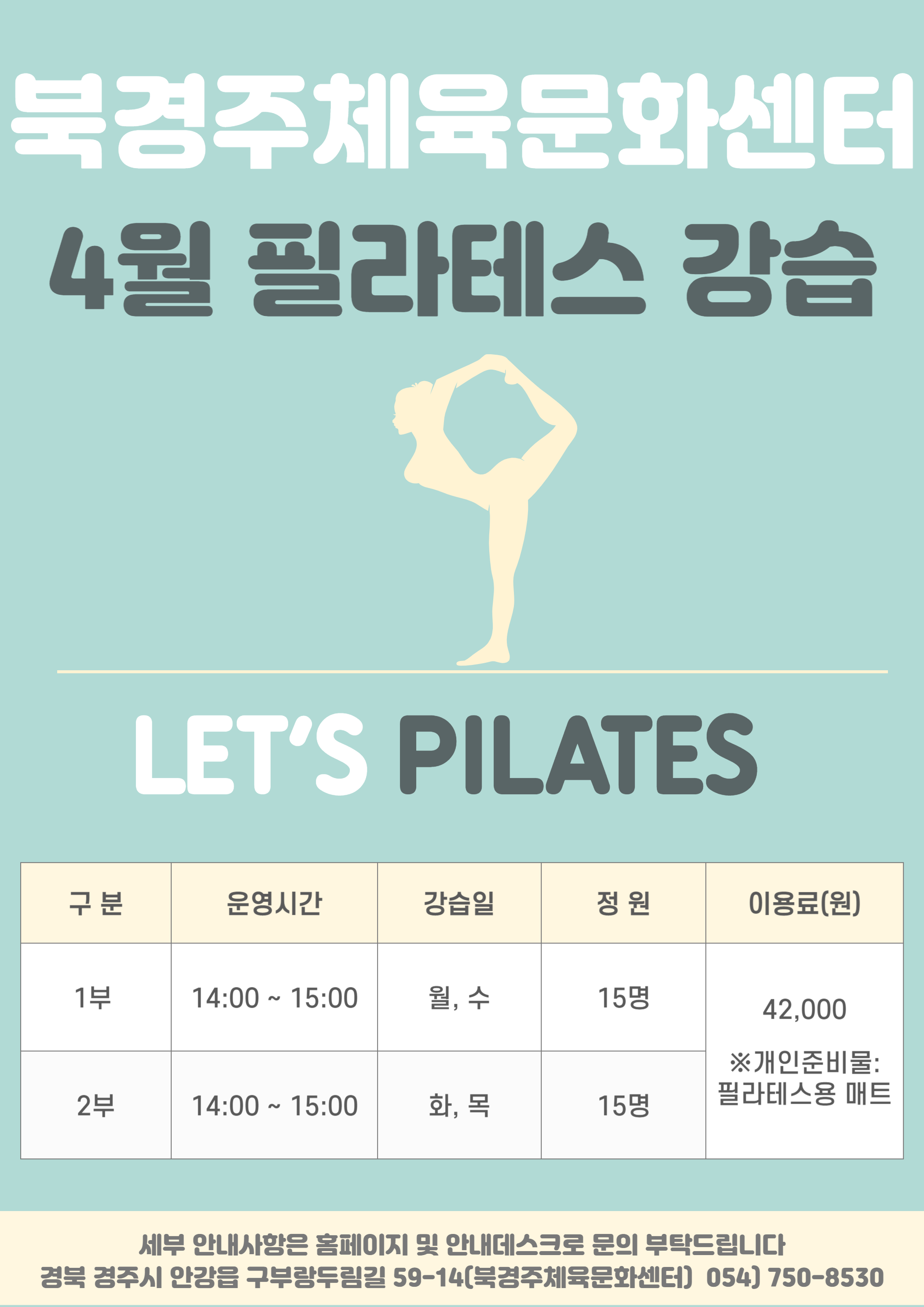 4월 필라테스 강습 안내 작성자 : 관리자 조회 : 309 등록일시 : 2023년 3월 29일 13시 16분 17초 필라테스 운영-001 (1).png [ Size : 449.48KB, Down : 331 ] 미리보기 다운로드 목록보기