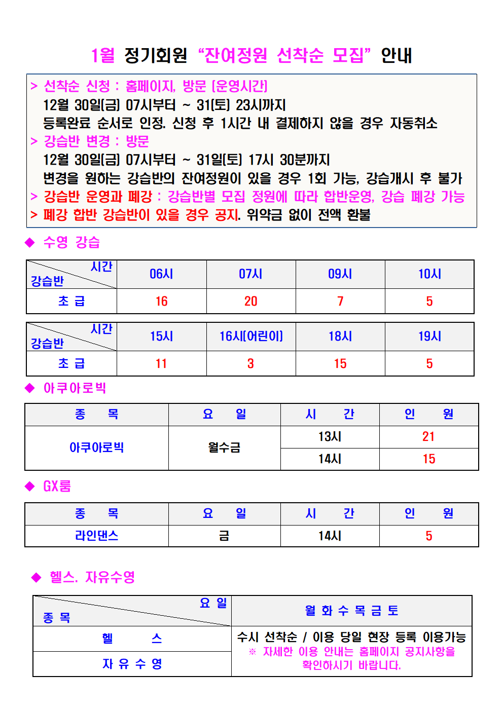 1월 정기회원 '잔여정원 선착순 모집' 안내 작성자 : 관리자 조회 : 663 등록일시 : 2022년 12월 28일 11시 23분 16초 선착순.png [ Size : 93.73KB, Down : 978 ] 미리보기 다운로드 목록보기