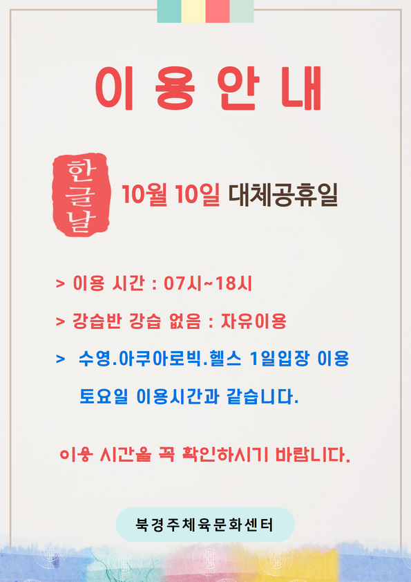 한글날, 대체공휴일(10월 10일) 이용 안내 작성자 : 관리자 조회 : 376 등록일시 : 2022년 10월 4일 10시 16분 47초 10월 10일 대체공휴일.png [ Size : 422.11KB, Down : 409 ] 미리보기 다운로드 목록보기