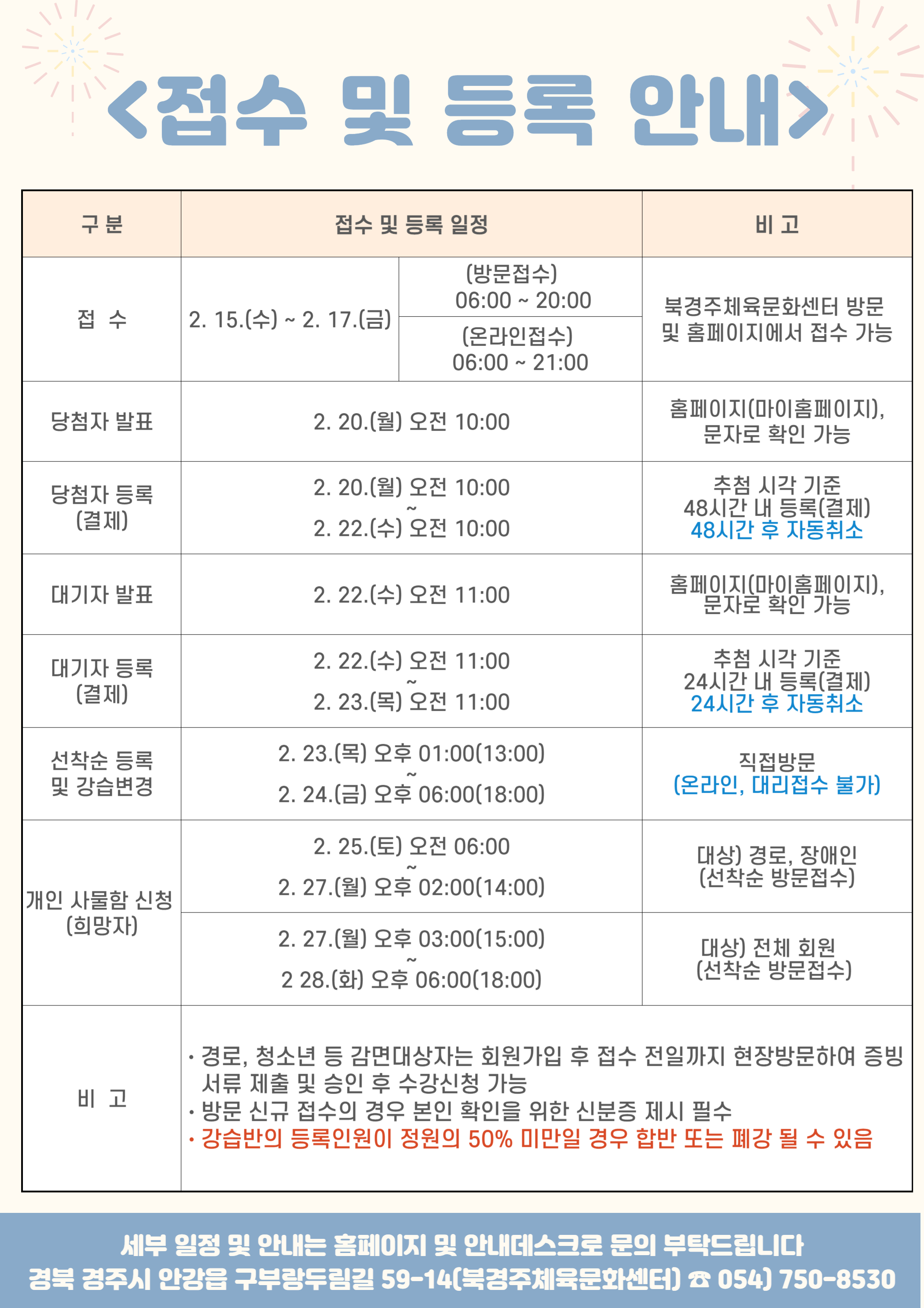 3월 정기회원 모집, 이용 안내 작성자 : 관리자 조회 : 700 등록일시 : 2023년 2월 10일 17시 23분 47초 3월강습.jpg [ Size : 1.12MB, Down : 1,061 ] 미리보기 다운로드 3월접수.jpg [ Size : 1.27MB, Down : 1,018 ] 미리보기 다운로드 목록보기