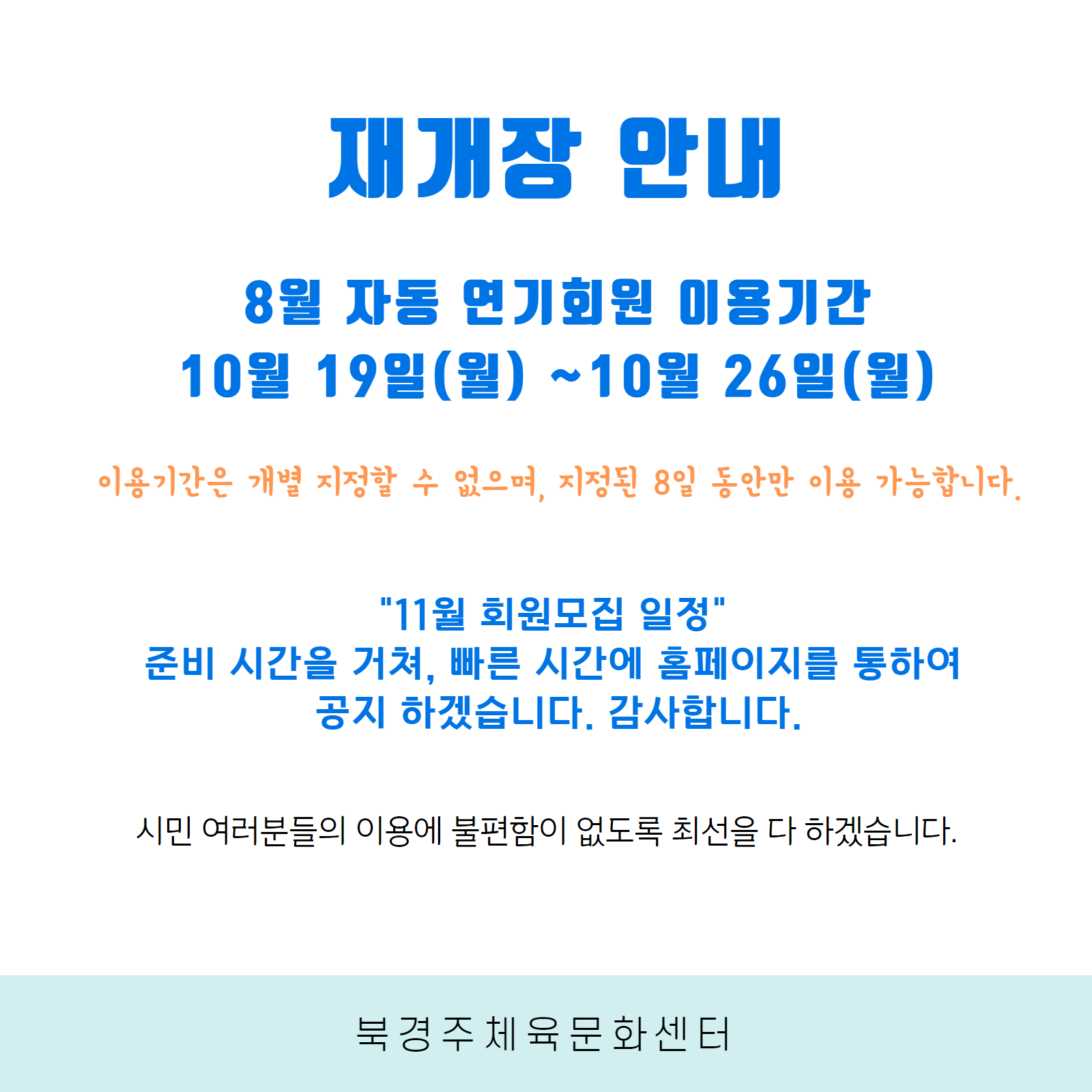 재개장 안내 및 8월 자동연기회원 이용일정 안내 작성자 : 관리자 조회 : 517 등록일시 : 2020년 10월 12일 12시 11분 33초 재개장안내.png [ Size : 98.67KB, Down : 543 ] 미리보기 다운로드 목록보기
