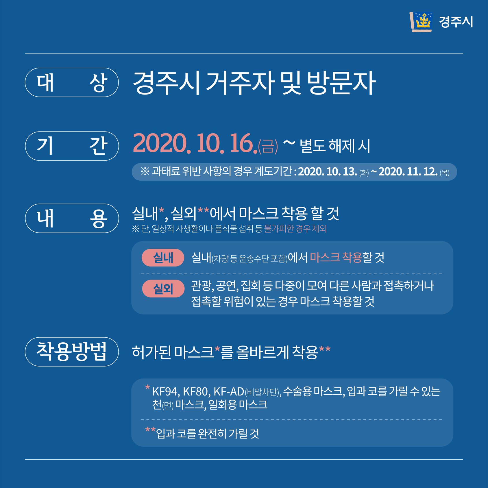 올바른 마스크 착용, 선택이 아닌 필수입니다! 마스크 착용 의무화 행정명령 변경 고시 작성자 : 관리자 조회 : 336 등록일시 : 2020년 10월 21일 8시 59분 45초 마스크1.jpg [ Size : 202.24KB, Down : 284 ] 미리보기 다운로드 마스크2.jpg [ Size : 221.23KB, Down : 208 ] 미리보기 다운로드 목록보기
