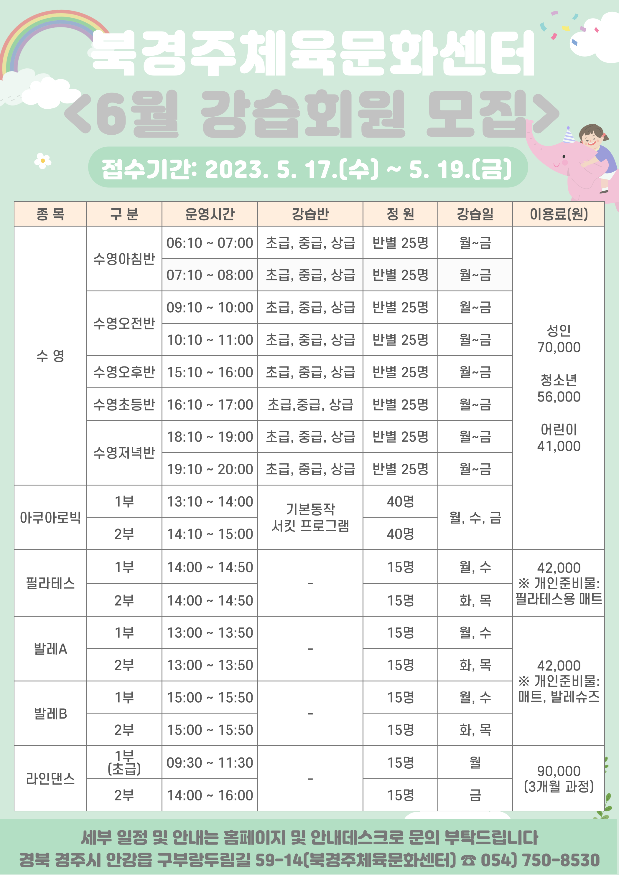 6월 정기회원 모집, 이용 안내 작성자 : 관리자 조회 : 618 등록일시 : 2023년 5월 10일 16시 3분 22초 강습회원모집(6월).png [ Size : 596.7KB, Down : 924 ] 미리보기 다운로드 접수및등록안내(6월).png [ Size : 534.66KB, Down : 887 ] 미리보기 다운로드 목록보기