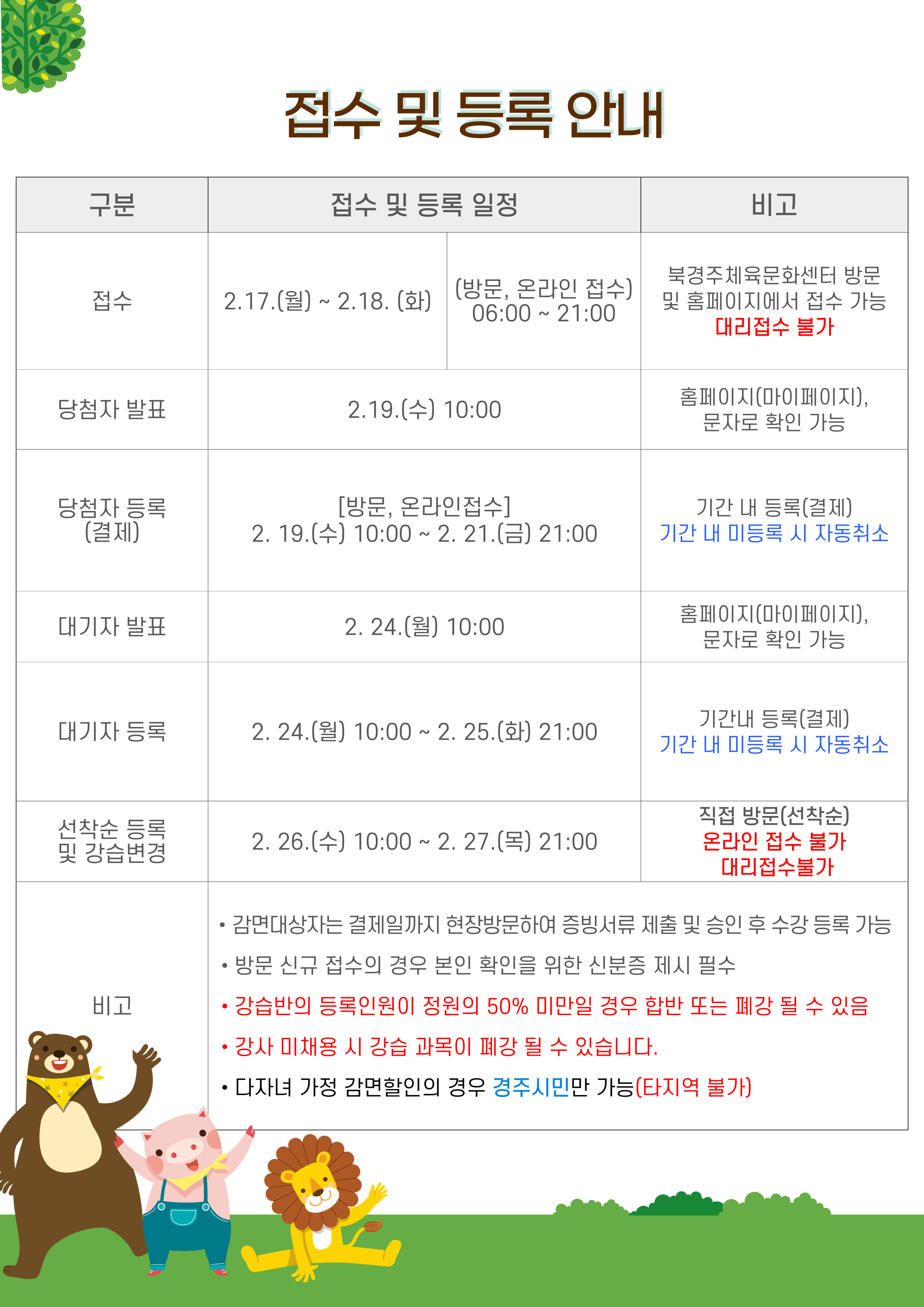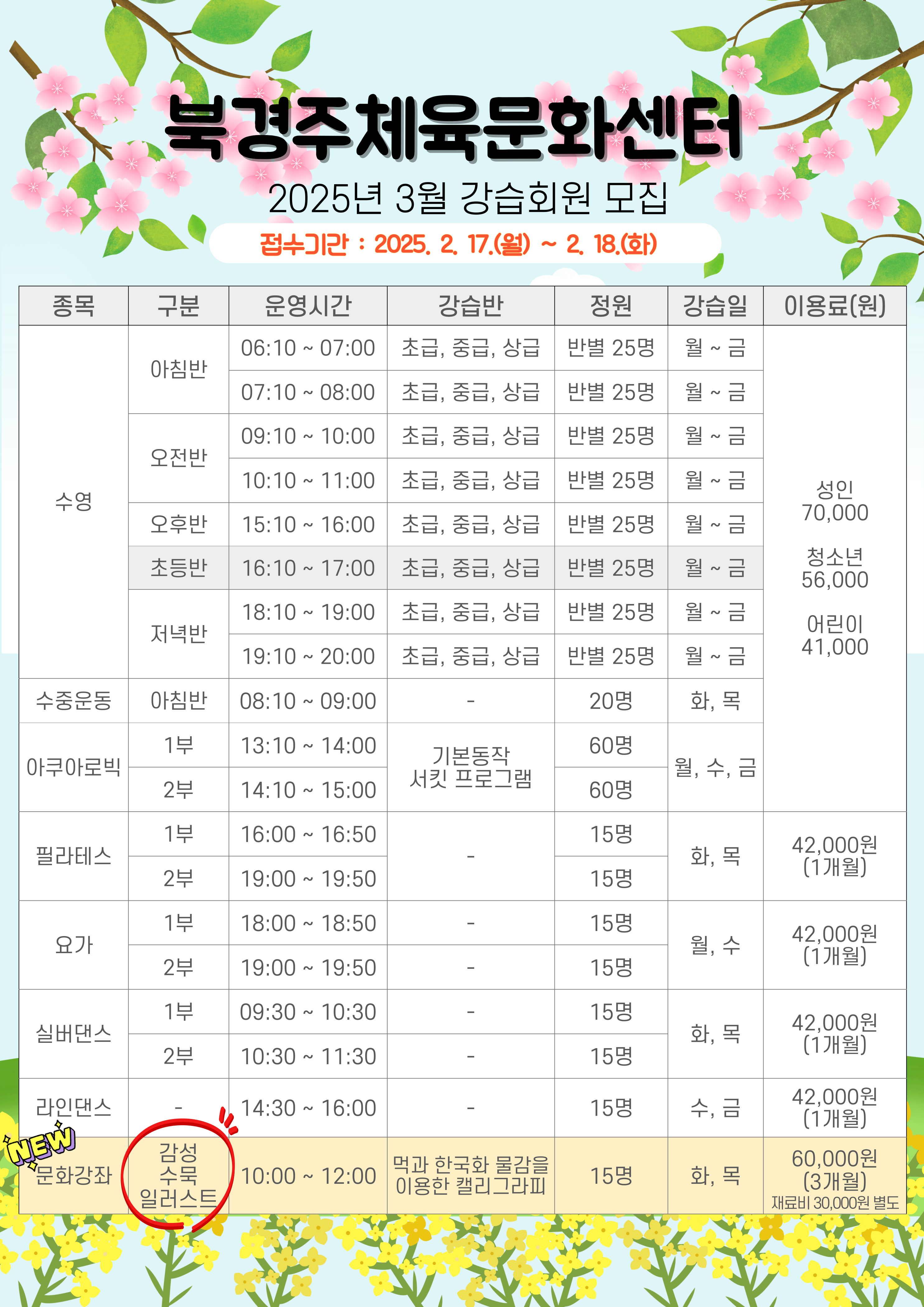 2025년 3월 강습 모집 & 접수 및 등록 안내 작성자 : 관리자 조회 : 591 등록일시 : 2025년 2월 12일 10시 52분 55초 001.png [ Size : 2.24MB, Down : 962 ] 미리보기 다운로드 002.png [ Size : 811.91KB, Down : 881 ] 미리보기 다운로드 목록보기