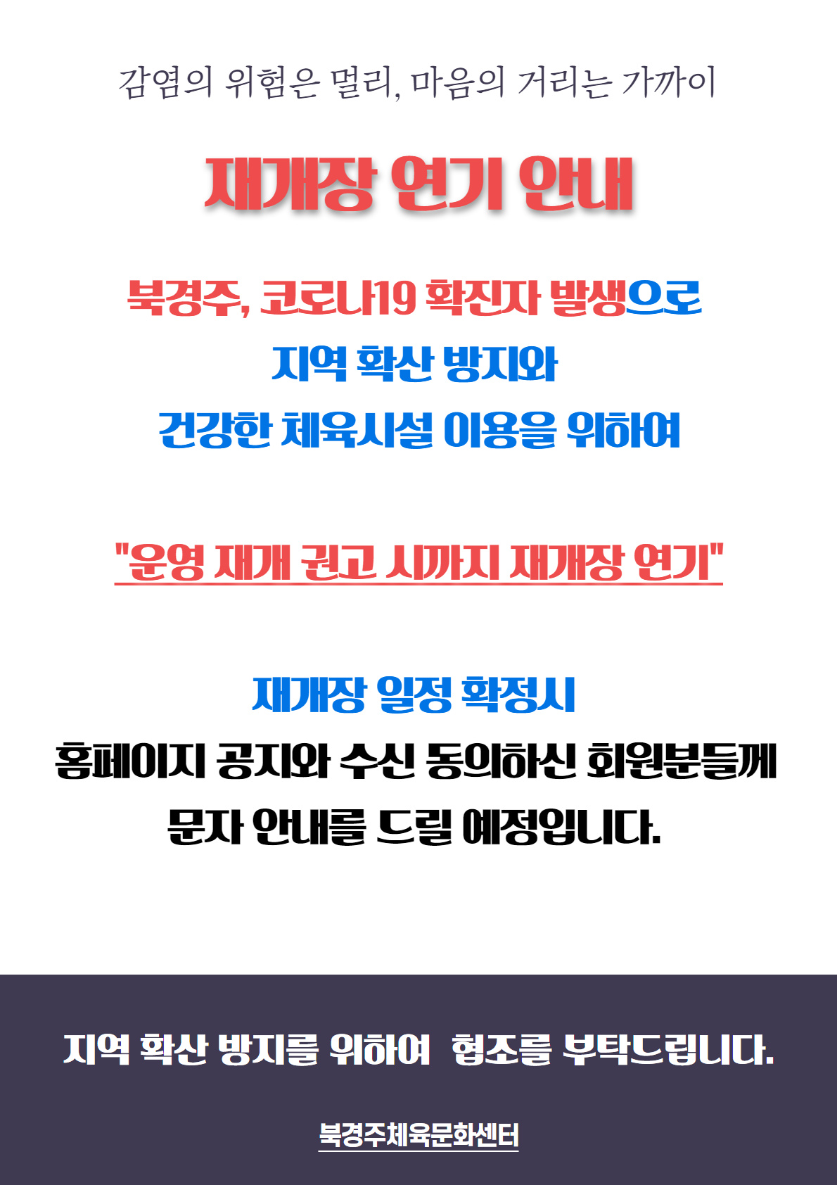 3월 재개장 연기 안내 작성자 : 관리자 조회 : 611 등록일시 : 2021년 2월 24일 11시 29분 56초 3월 재개장 연기 안내.jpg [ Size : 336.4KB, Down : 663 ] 미리보기 다운로드 목록보기