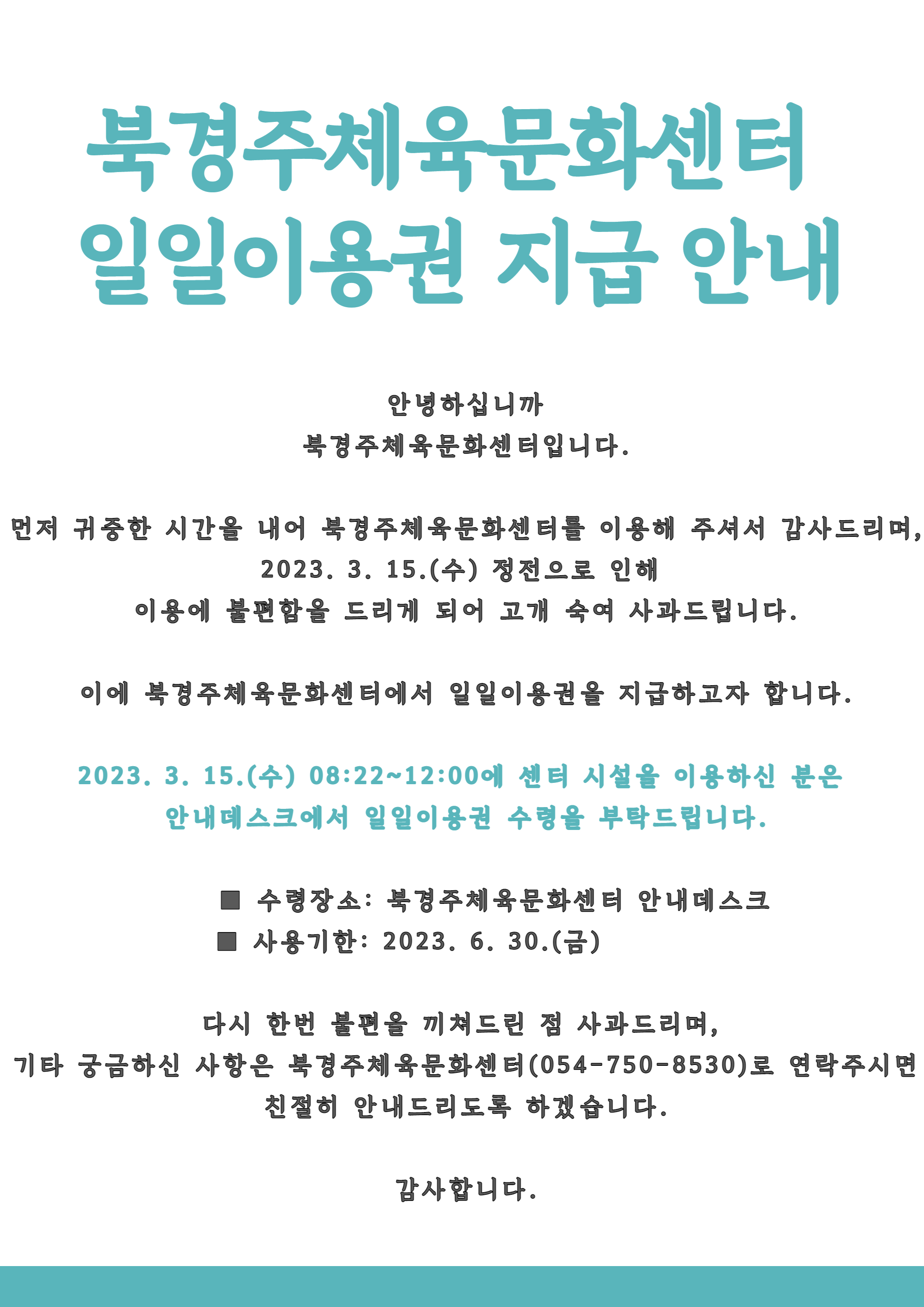 일일 이용권 지급 안내 작성자 : 관리자 조회 : 669 등록일시 : 2023년 4월 13일 16시 45분 34초 일일이용권 지급안내.png [ Size : 677.92KB, Down : 802 ] 미리보기 다운로드 목록보기