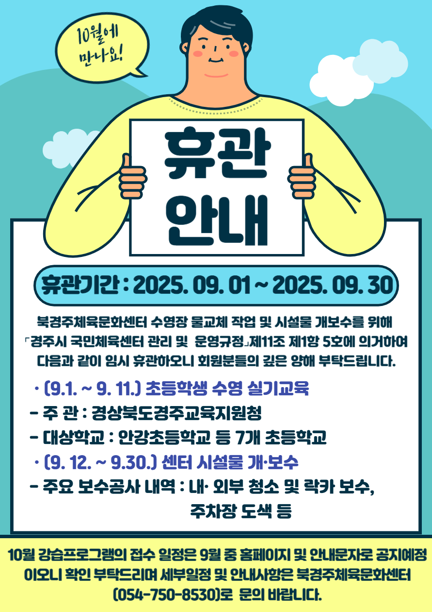 북경주체육문화센터 휴관 안내 작성자 : 관리자 조회 : 438 등록일시 : 2025년 8월 18일 14시 1분 46초 북경주휴관-001 (1).png [ Size : 317.95KB, Down : 530 ] 미리보기 다운로드 목록보기
