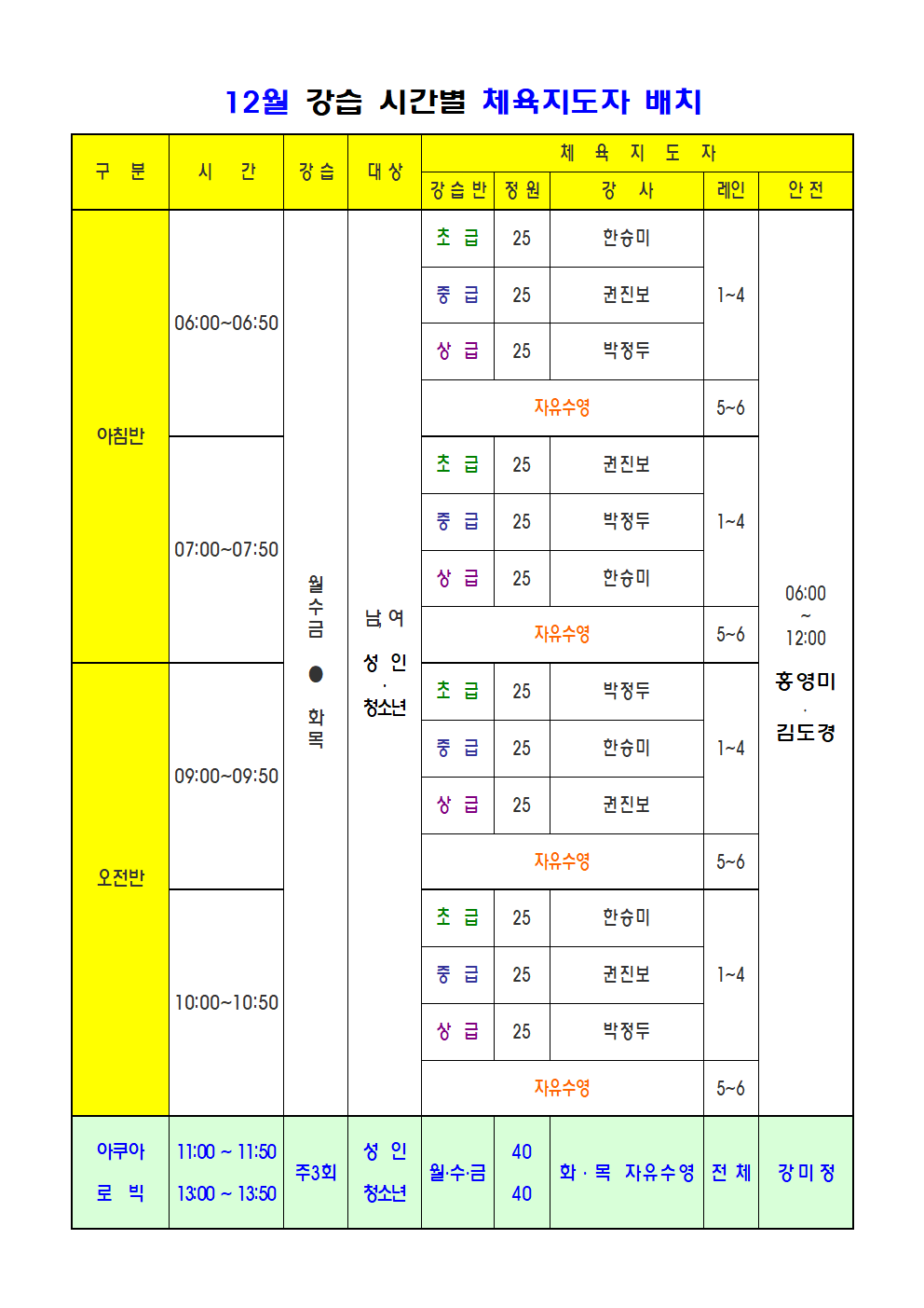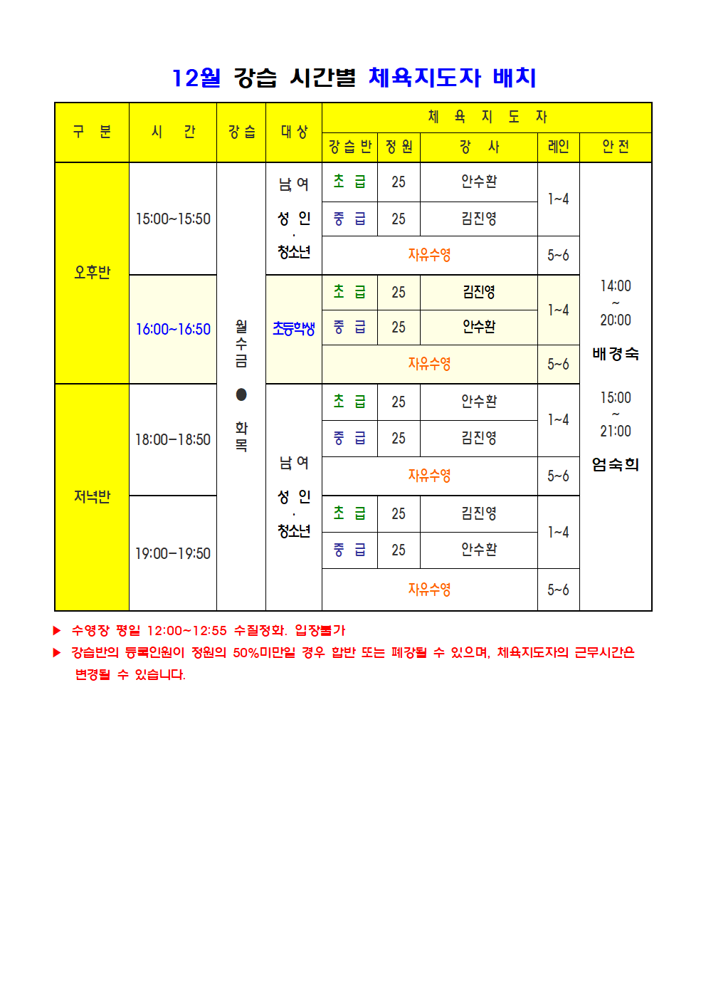 12월, 수영 강습반 체육지도자 배치 안내 작성자 : 관리자 조회 : 745 등록일시 : 2022년 11월 25일 9시 56분 12초 image001.png [ Size : 58.07KB, Down : 897 ] 미리보기 다운로드 image002.png [ Size : 57.26KB, Down : 906 ] 미리보기 다운로드 목록보기