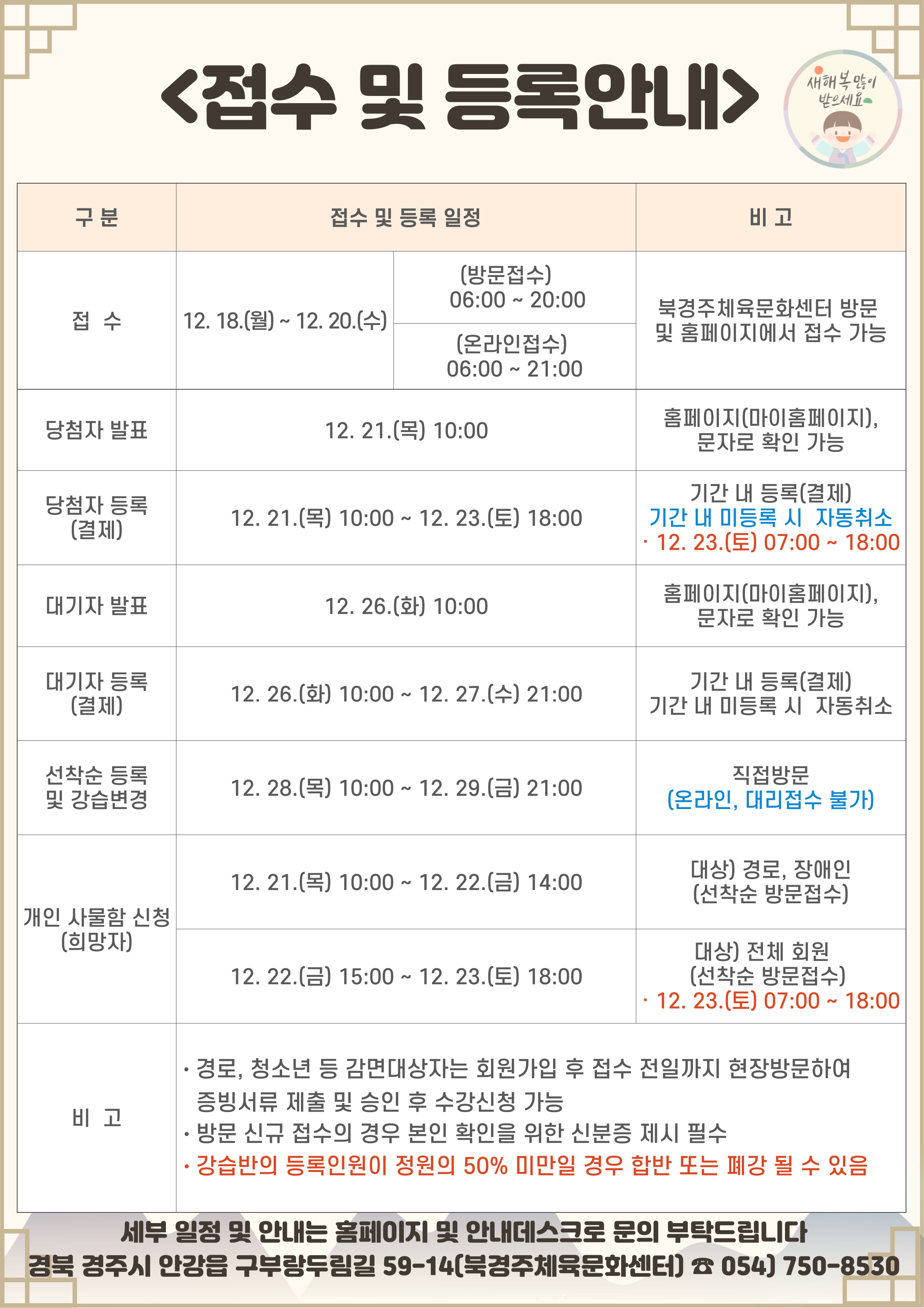 1월 정기회원 모집, 이용 안내 작성자 : 관리자 조회 : 514 등록일시 : 2023년 12월 13일 17시 34분 30초 강습회원모집(1월).png [ Size : 623.36KB, Down : 649 ] 미리보기 다운로드 접수및등록안내(1월).png [ Size : 616.39KB, Down : 635 ] 미리보기 다운로드 목록보기