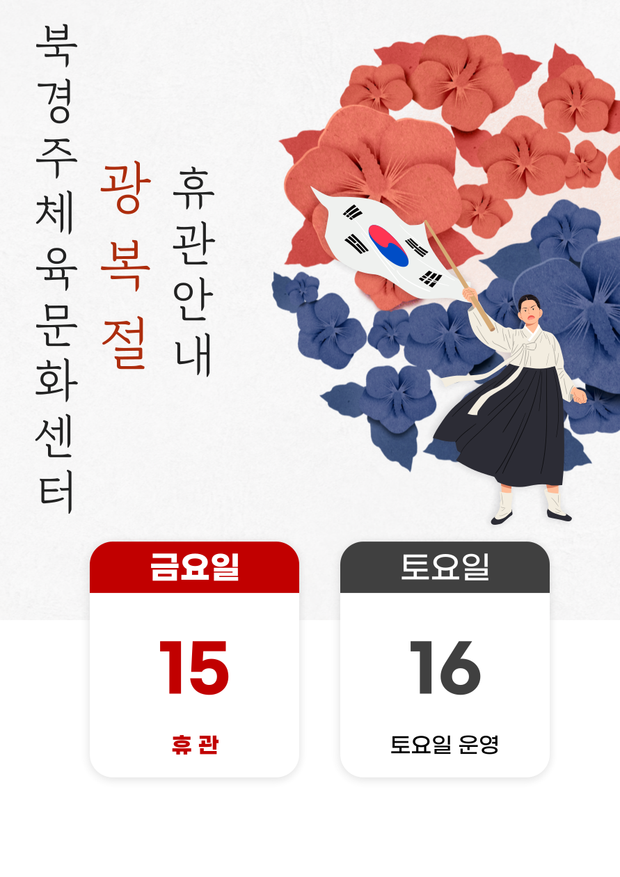 북경주체육문화센터 8.15 (광복절) 휴관안내 작성자 : 관리자 조회 : 163 등록일시 : 2025년 8월 6일 16시 8분 42초 광복절-휴관-안내-001.png [ Size : 871.65KB, Down : 170 ] 미리보기 다운로드 목록보기
