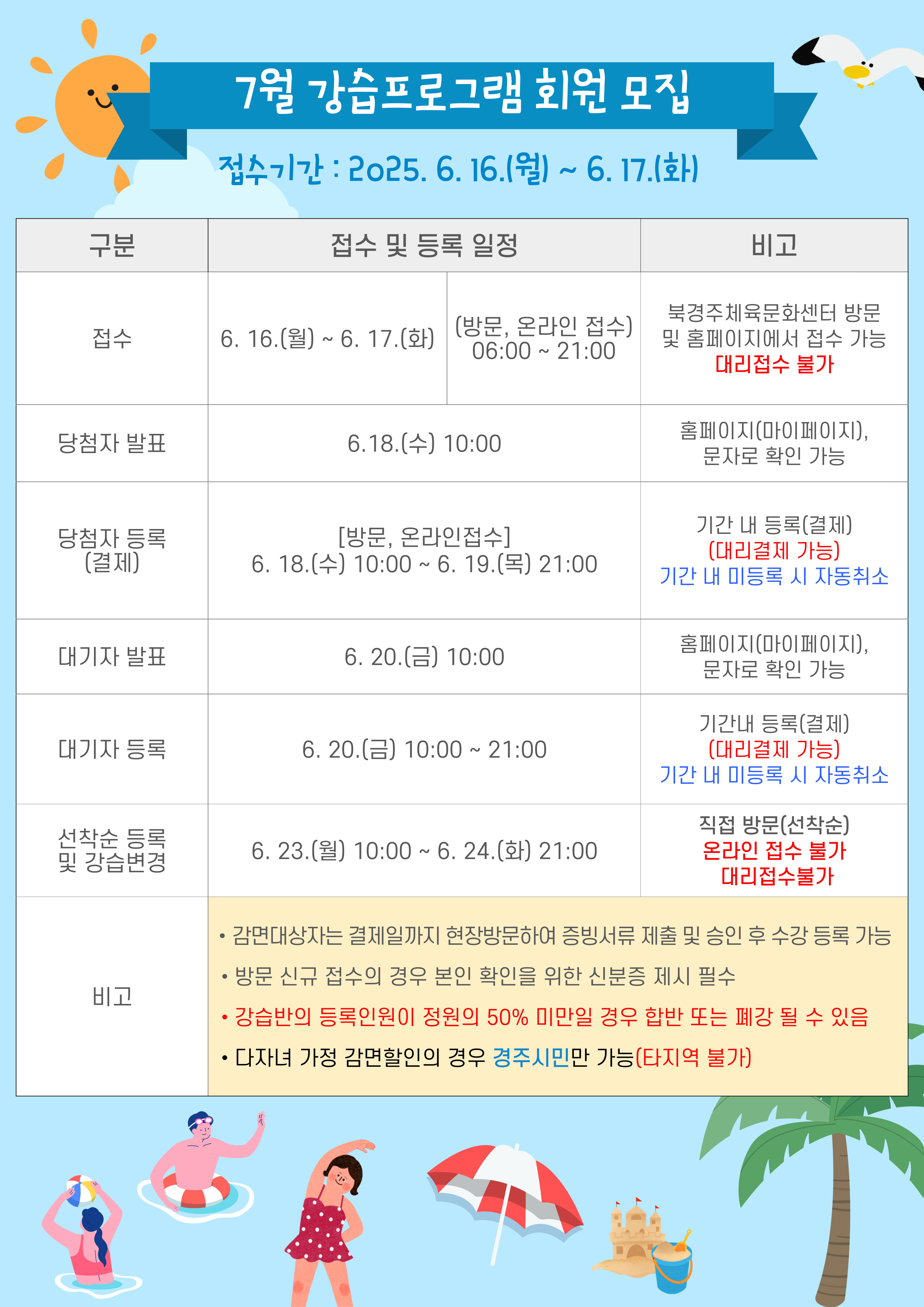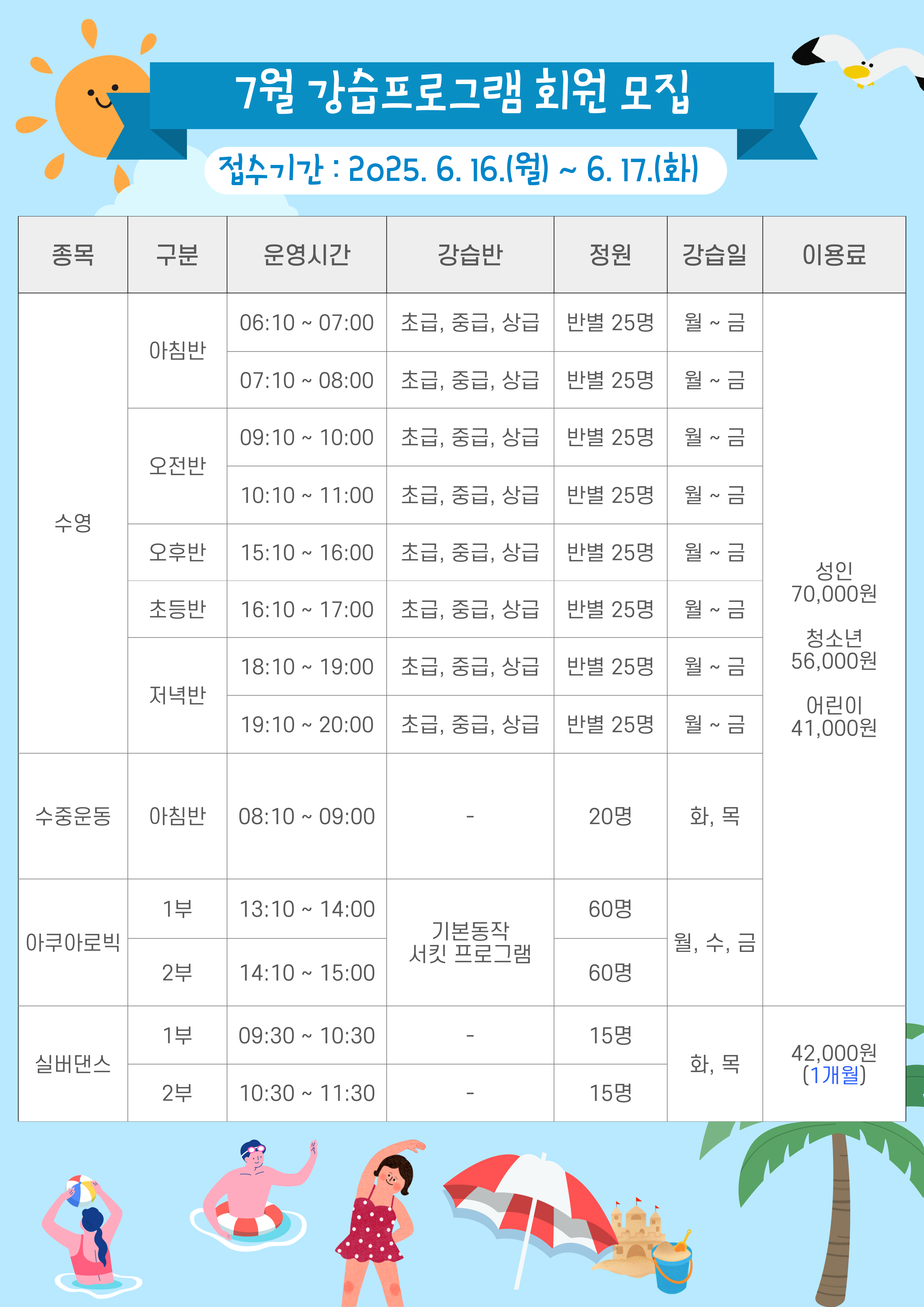 2025년 7월 강습 모집 및 등록 안내 작성자 : 관리자 조회 : 691 등록일시 : 2025년 6월 12일 10시 49분 51초 회원모집 안내문(7월)_page0_image.jpg [ Size : 1009.26KB, Down : 1,034 ] 미리보기 다운로드 회원모집 안내문(7월)_page1_image.jpg [ Size : 1.02MB, Down : 1,013 ] 미리보기 다운로드 목록보기