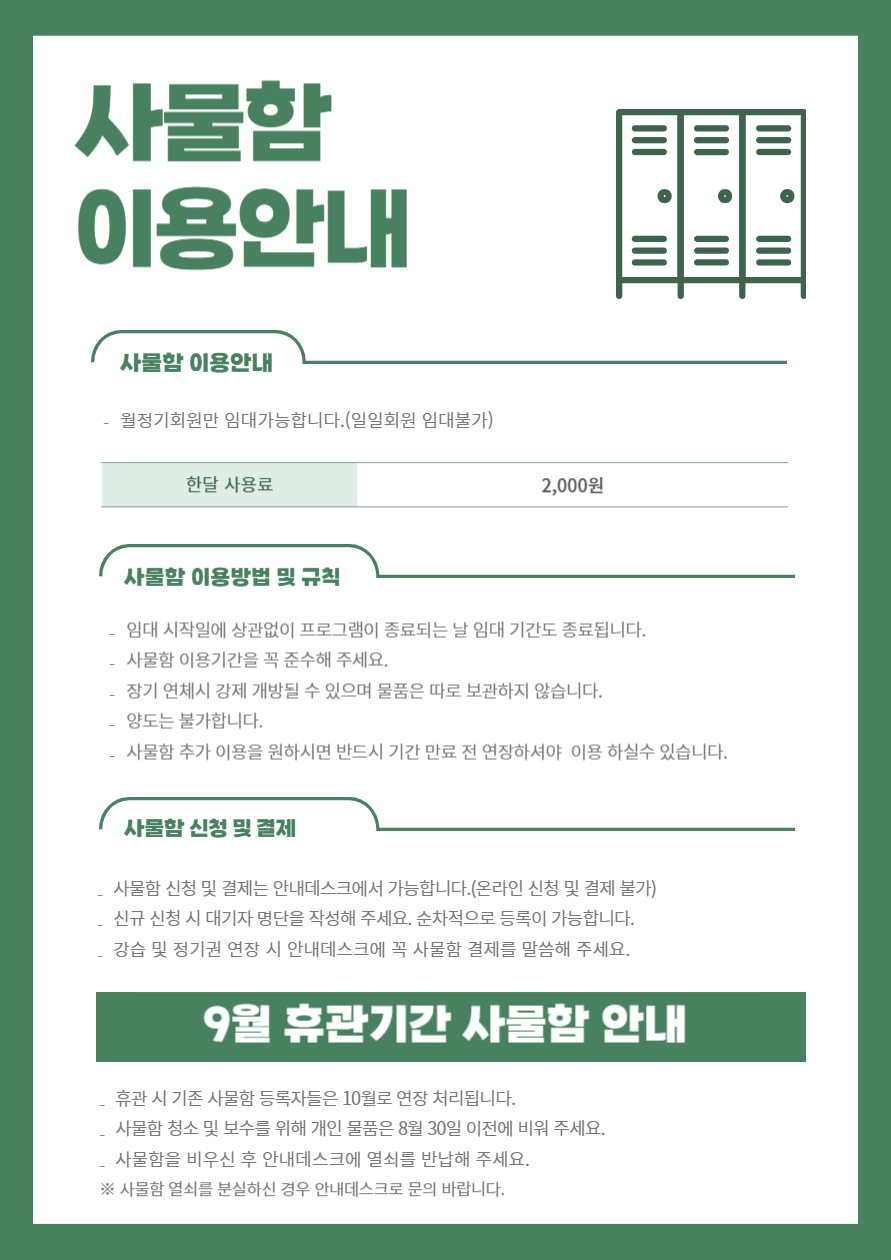 공지 북경주체육문화센터 사물함 이용 안내 작성자 : 관리자 조회 : 245 등록일시 : 2025년 8월 18일 14시 5분 43초 북경주사물함-001.png [ Size : 150.75KB, Down : 265 ] 미리보기 다운로드 목록보기