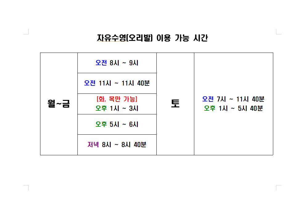 자유수영(월회원&일일회원) 이용회원은 월,수,금은 오후15 :00부터 입장이 가능합니다.
