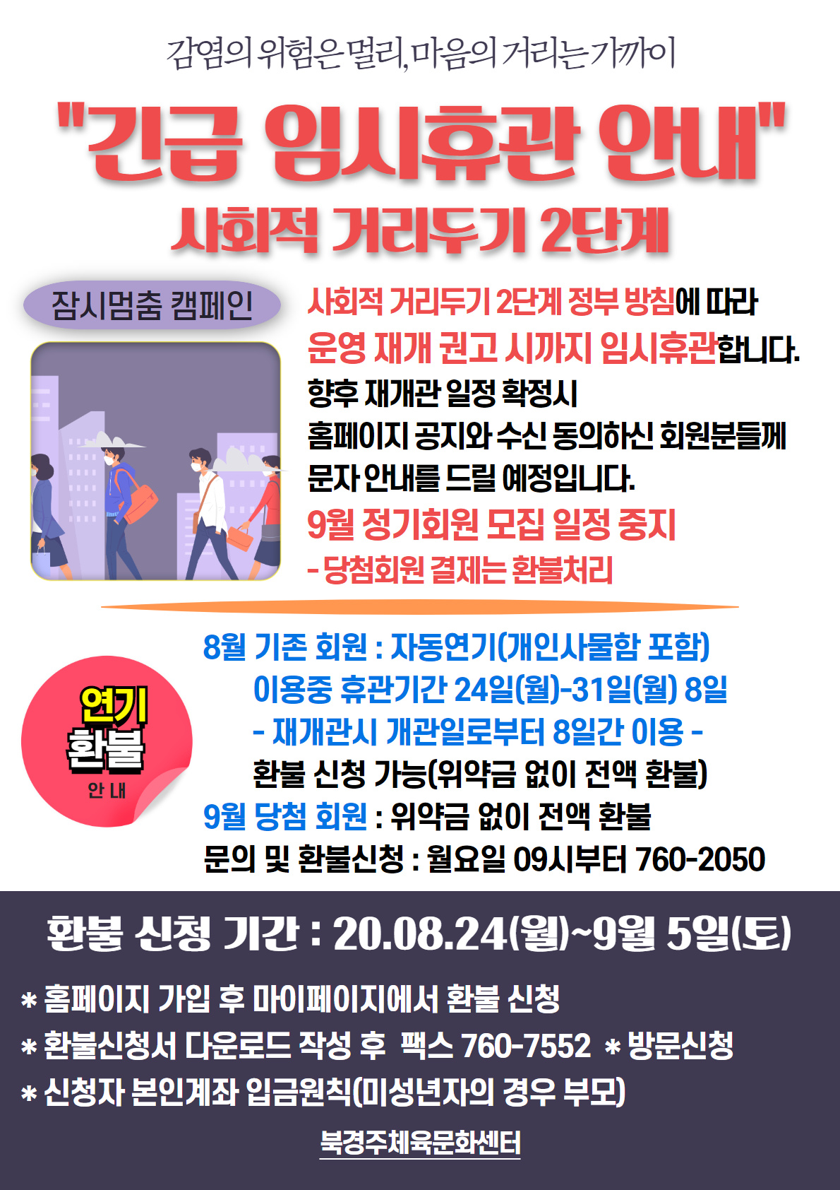 긴급 임시휴관 및 환불신청(신청서 첨부) 안내 작성자 : 관리자 조회 : 1,546 등록일시 : 2020년 8월 23일 12시 28분 12초 긴급임시휴관 (1).jpg [ Size : 745.92KB, Down : 1,416 ] 미리보기 다운로드 환불신청서.hwp [ Size : 13.5KB, Down : 434 ] 다운로드 사회적 거리두기 2단계 23일부터 전국 확대 알림 코로나19 확산 방지를 위해 시민 여러분의 적극적인 협조를 부탁드립니다.최 대한 외출을 자제하여 주시고, 방역수칙을 철저히 지켜주시기 바랍니다. 목록보기