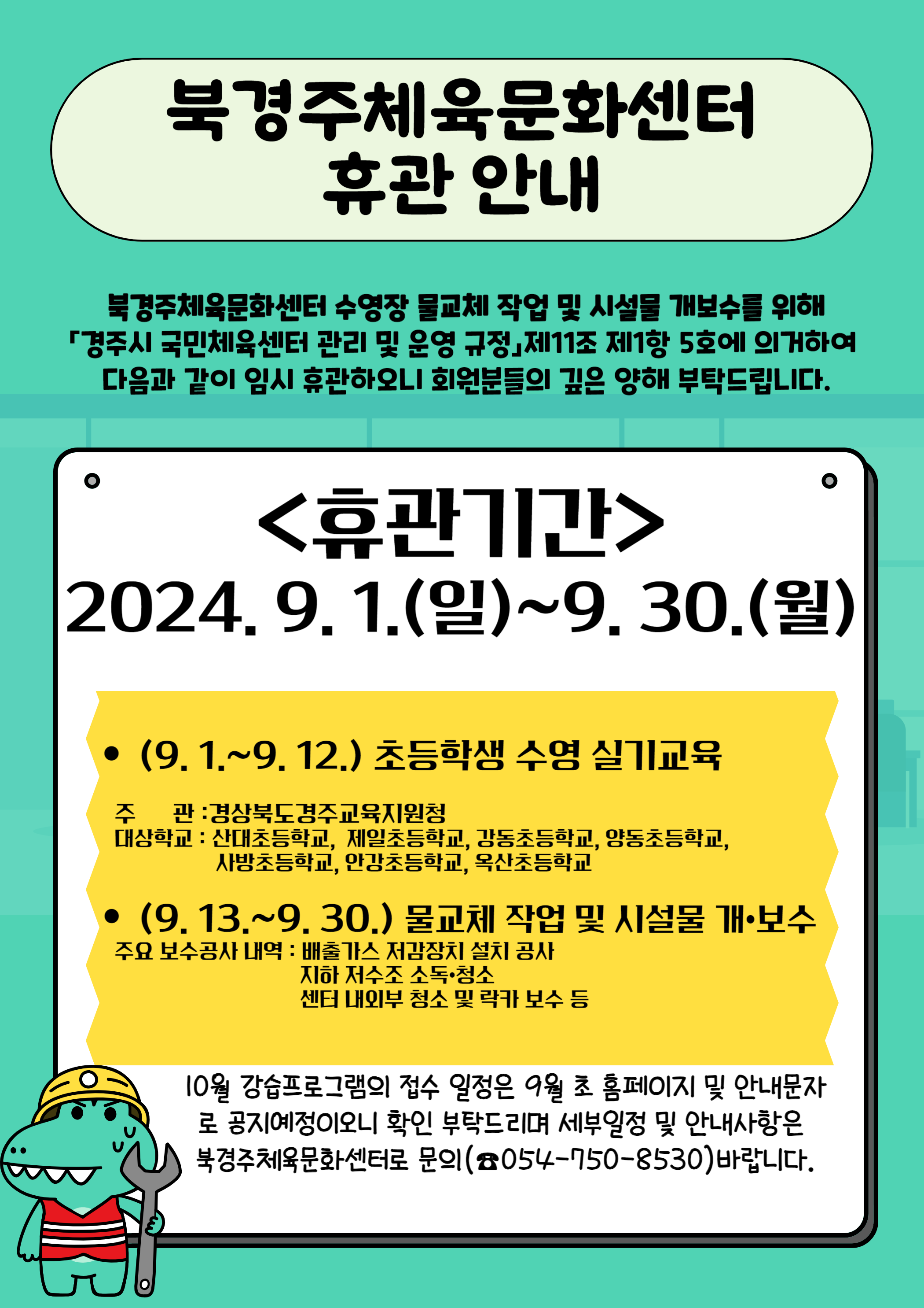 북경주체육문화센터 휴관 안내 작성자 : 관리자 조회 : 1,080 등록일시 : 2024년 8월 1일 11시 43분 49초 휴관.png [ Size : 927.32KB, Down : 1,599 ] 미리보기 다운로드 목록보기