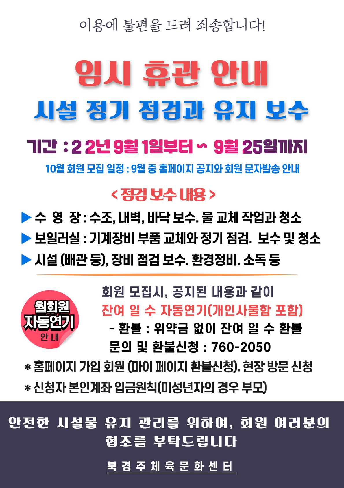 [ 임시 휴관 일정 안내 ] 시설 정기 점검과 유지 보수 작성자 : 관리자 조회 : 1,134 등록일시 : 2022년 8월 10일 10시 25분 45초 9월 정기점검과 보수를 위한 휴관 안내.png [ Size : 509.76KB, Down : 1,284 ] 미리보기 다운로드 목록보기