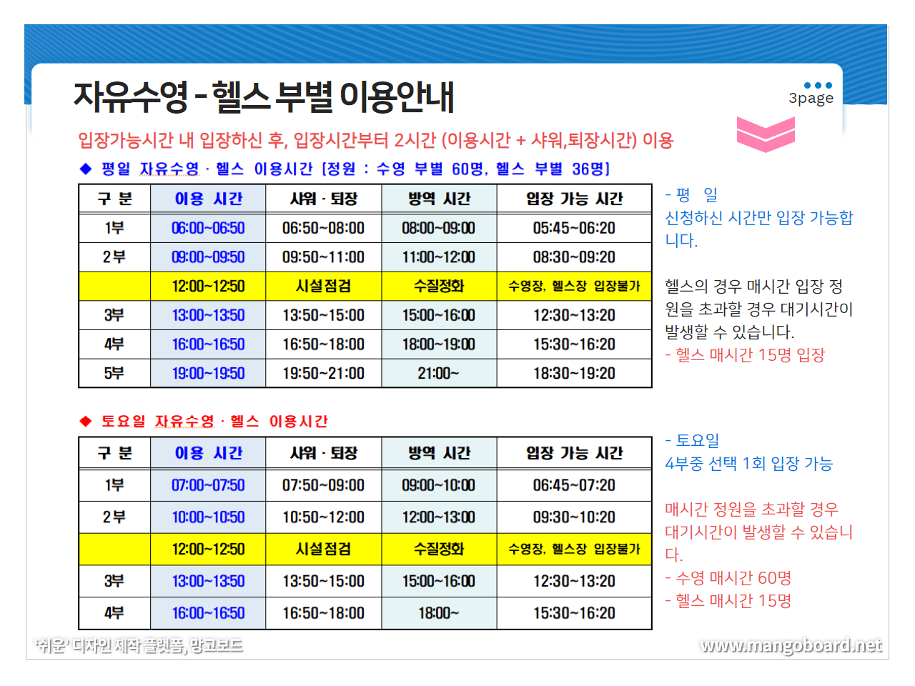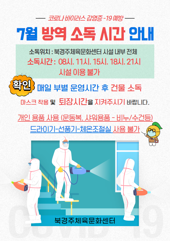7월 임시운영 이용 안내 (방역 소독 시간, 이용시간) 작성자 : 관리자 조회 : 696 등록일시 : 2020년 6월 29일 15시 4분 13초 방역소독시간안내.png [ Size : 350.77KB, Down : 1,141 ] 미리보기 다운로드 4.png [ Size : 328.21KB, Down : 714 ] 미리보기 다운로드 회원카드는 최초 방문일에 안내데스크에서 발급해 드립니다.회원 정보 등록을 위한 사진 촬영에 협조를 부탁드립니다. 목록보기