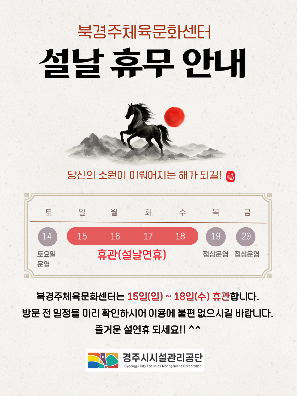 공지 북경주체육문화센터 설 연휴 운영 안내 작성자 : 관리자 조회 : 21 등록일시 : 2026년 2월 9일 16시 23분 31초 북경주 설연휴.png [ Size : 486.24KB, Down : 21 ] 미리보기 다운로드 목록보기