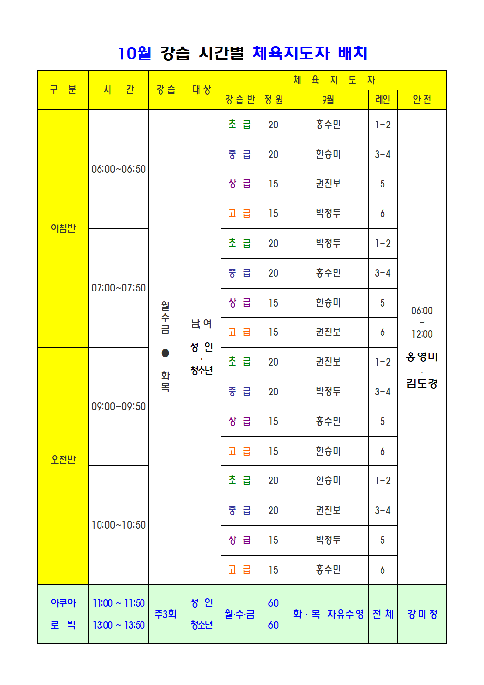 10월, 수영 강습반 체육지도자 배치 안내 작성자 : 관리자 조회 : 561 등록일시 : 2022년 9월 29일 9시 16분 49초 image003.png [ Size : 57.3KB, Down : 710 ] 미리보기 다운로드 image004.png [ Size : 71.86KB, Down : 673 ] 미리보기 다운로드 목록보기