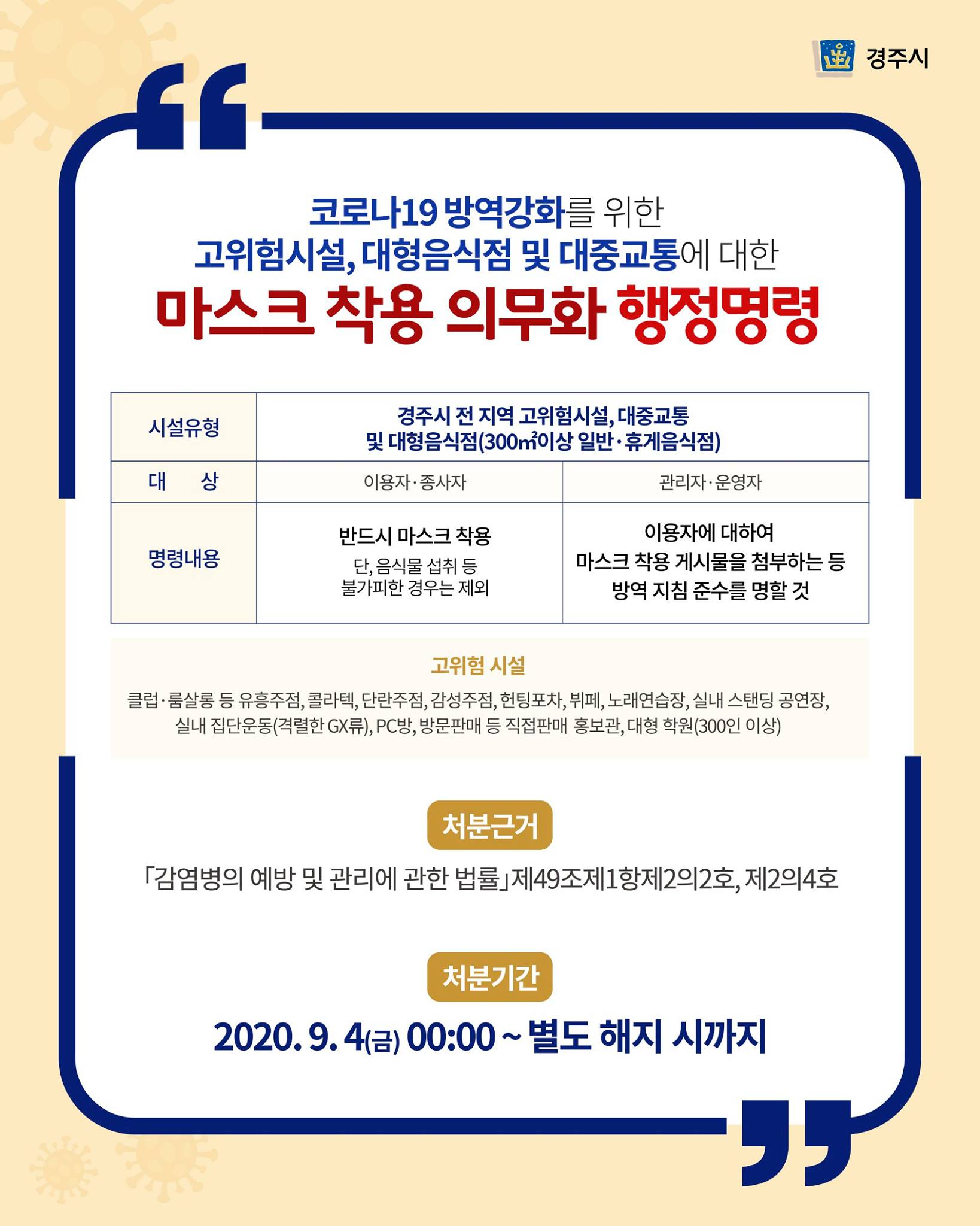 경주시 마스크 착용 의무화 행정명령 안내 작성자 : 관리자 조회 : 372 등록일시 : 2020년 9월 4일 10시 13분 36초 마스크의무화.jpg [ Size : 203.38KB, Down : 268 ] 미리보기 다운로드 코로나19 방역강화를 위하여 고위험시설, 대형음식점 및 대중교통 이용시 잊지말고, 반드시 마스크 착용 부탁드립니다 ! 2020.9.4(금) 00:00 ~ 별도 해지 시까지 10만원 이하의 과태료 위반처분(계도기간: 2020.9.4. ~10.12) / 시행 2020. 10.13. 목록보기