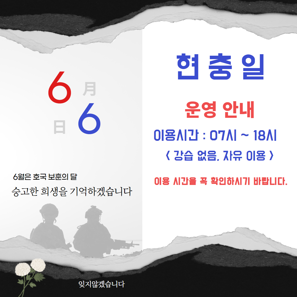 6월 6일 '현충일' 이용안내 작성자 : 관리자 조회 : 464 등록일시 : 2022년 6월 2일 9시 10분 11초 현충일.png [ Size : 448.67KB, Down : 445 ] 미리보기 다운로드 목록보기