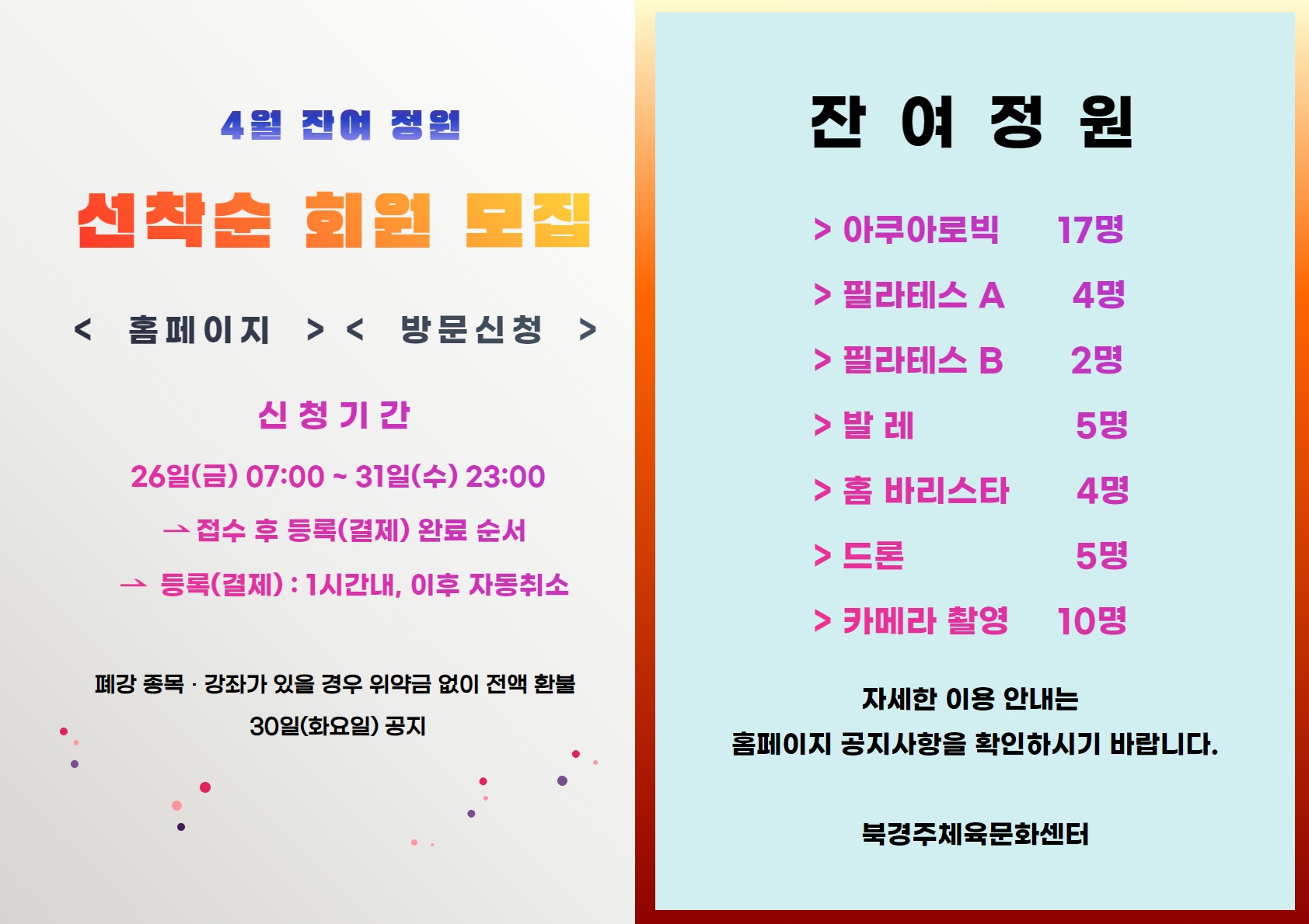 4월 잔여정원 선착순 회원모집 안내 작성자 : 관리자 조회 : 559 등록일시 : 2021년 3월 25일 9시 15분 15초 잔여정원 선착순.jpg [ Size : 245.71KB, Down : 567 ] 미리보기 다운로드 목록보기